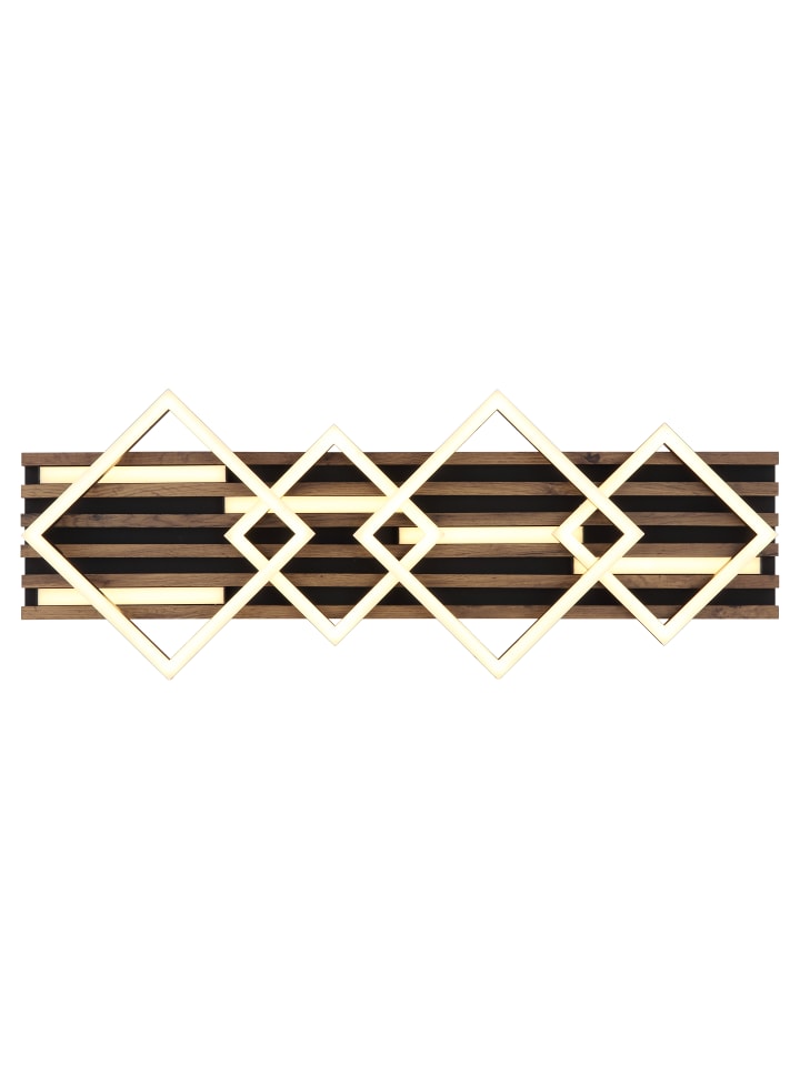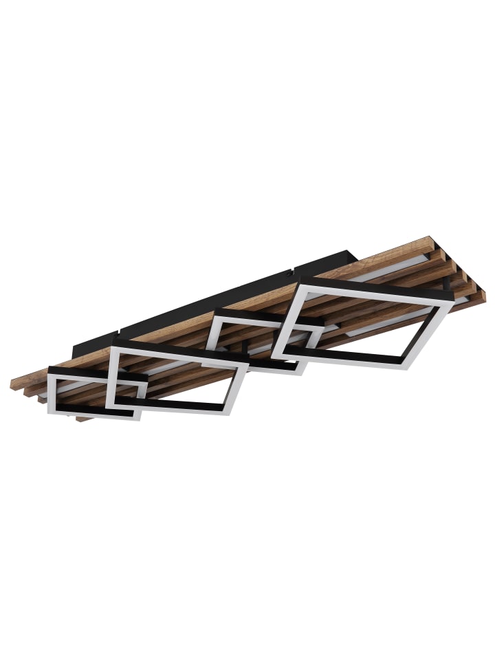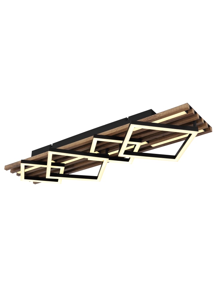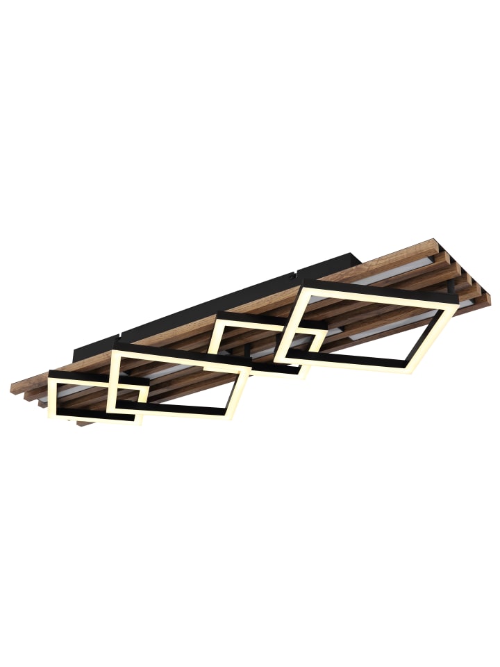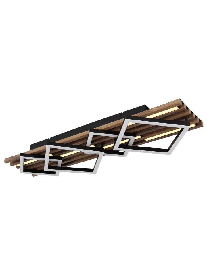 Потолочный светильник, матовый черный металл, МДФ с имитацией темного дерева, матовый черный пластик, опаловый пластик, несколько уровней яркости с помощью настенного переключателя, функция памяти, 3 уровня: только рама 1520 лм - только светодиоды на панели 640 лм - оба вместе 2160 лм, ДxШxВ: 820x310x95 мм, вкл. светодиод 42 Вт 230 В, источник 4340 лм, светоотдача 2160 лм, 3000 К