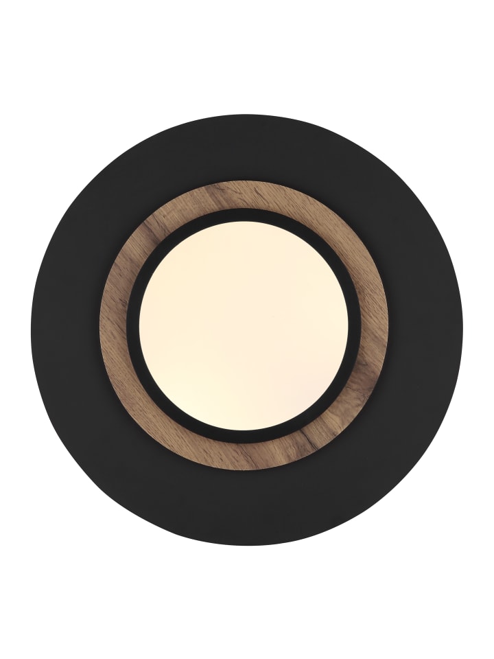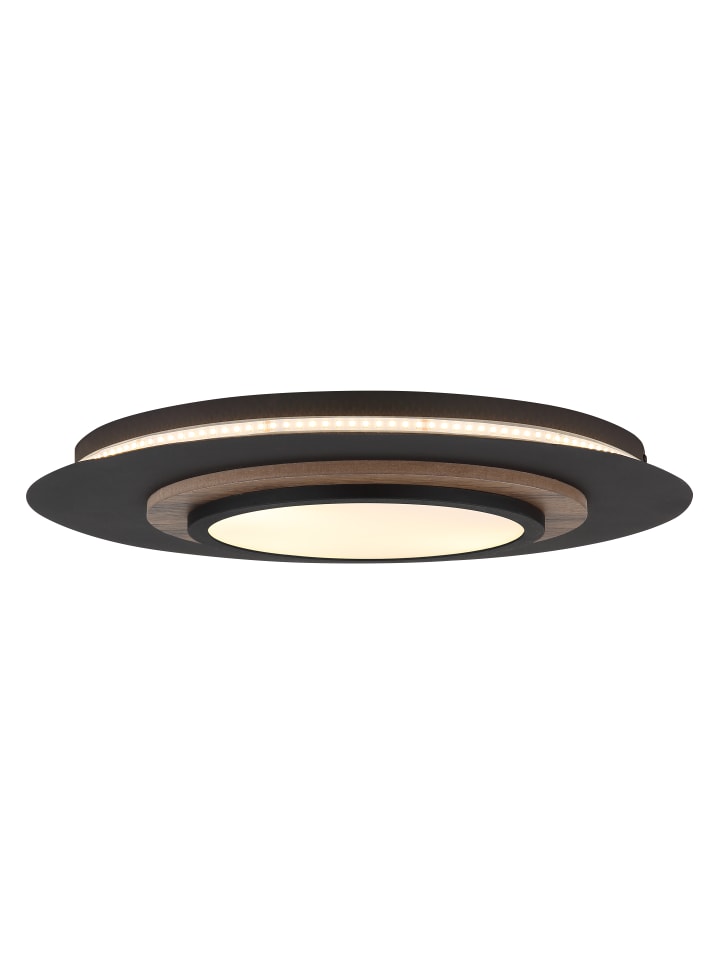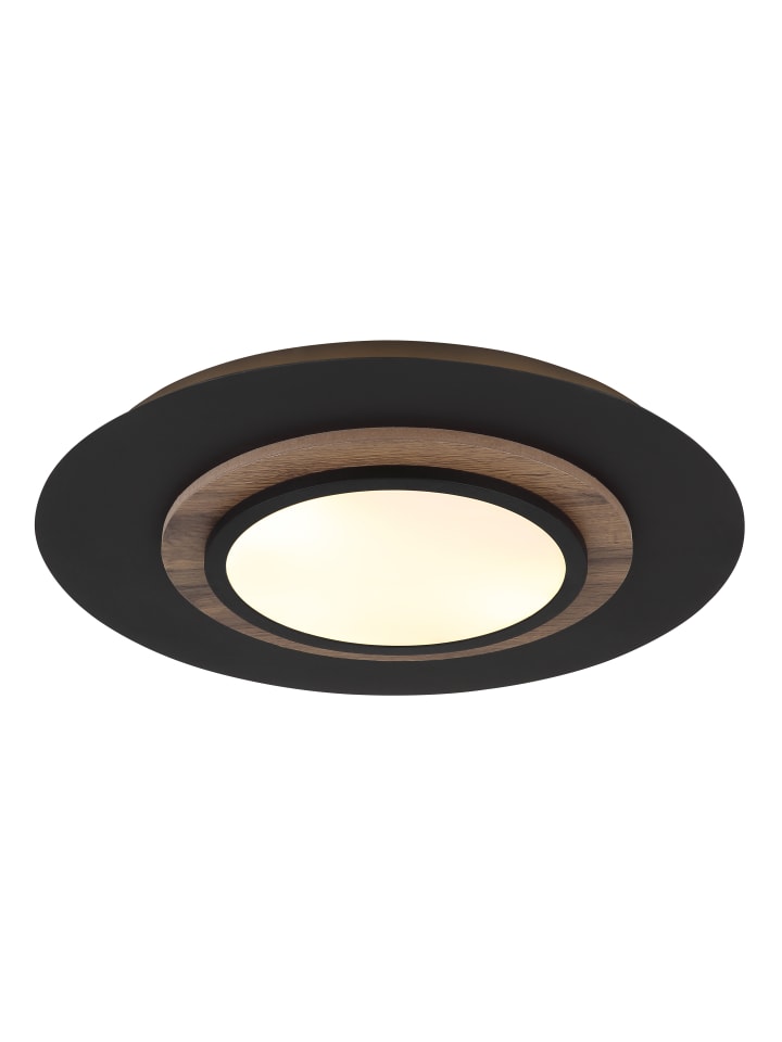 Потолочный светильник, матовый черный металл, МДФ с имитацией темного дерева, опаловый пластик, несколько настроек с помощью настенного переключателя, функция памяти, 3 настройки: все вместе, только кольцо вниз, только подсветка, ø: 480 мм, H: 56 мм, диаметр светодиодного кольца: 23 см, диаметр дерева: 32 см, в комплекте светодиод 24 Вт 230 В, источник 2490 лм, световой поток 1120 лм, 3000 К