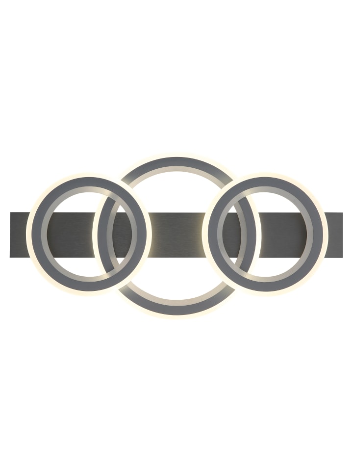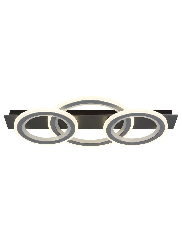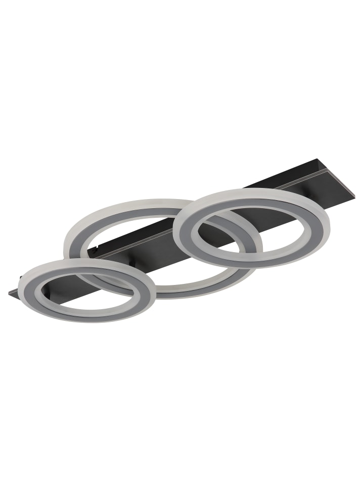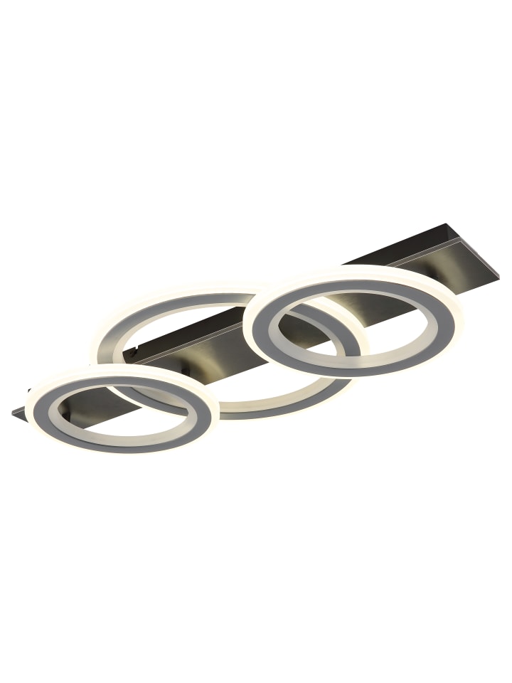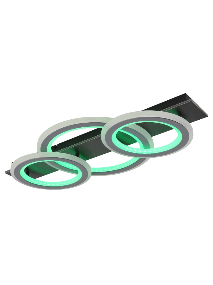 Потолочный светильник, матовый черный металл, матовый серый пластик, светло-серый металл, опаловый акрил, регулировка яркости, несколько уровней с помощью настенного переключателя, возможность фиксации цветов, RGB-переключатель, RGB-цвета можно фиксировать, эффект радуги RGB, функция памяти, пульт дистанционного управления, батарейки в комплекте (2 x AAA), Д x Ш x В: 730 x 370 x 80 мм, диаметр кольца: 2 x 27 см, 1 x 37 см, в комплекте светодиод 40 Вт 230 В, источник света 490-4900 лм, световой поток 250-2500 лм, цветовая температура 3000-6500 К, в комплекте светодиод RGB 5 Вт 230 В