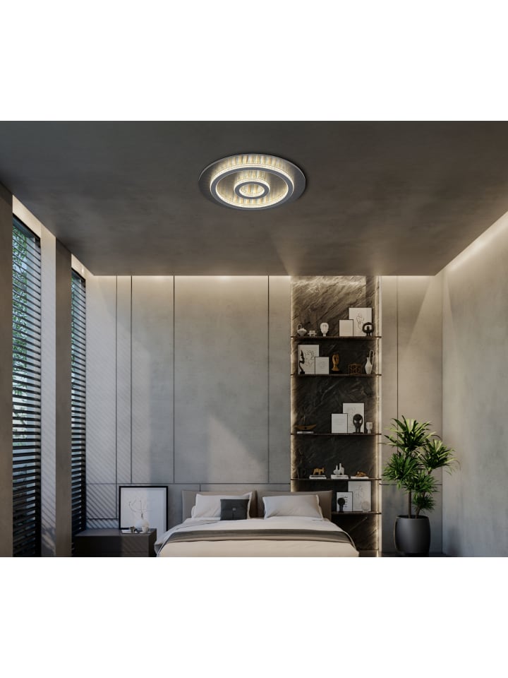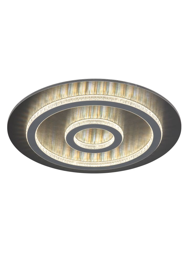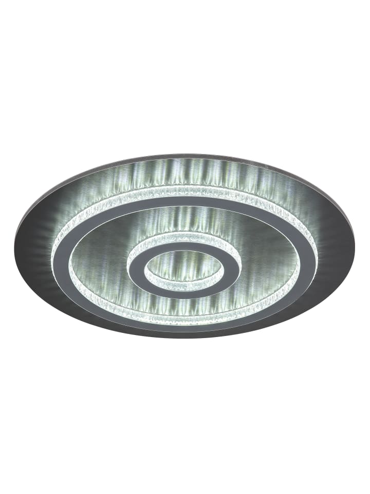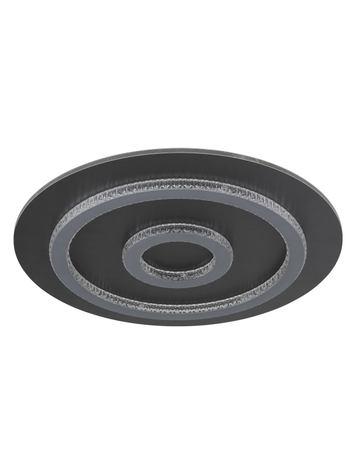 Потолочный светильник, металл матово-черный, пластик матовый антрацитовый, прозрачные пластиковые кристаллы, пластик матовый светло-серый, регулировка яркости, несколько уровней с помощью настенного переключателя, возможность фиксации цветов, функция памяти, ночник, таймер, пульт дистанционного управления, батарейки в комплекте (2 шт. AAA), диаметр: 450 мм, высота: 55 мм, в комплекте светодиод 40 Вт 230 В, источник света 400-4700 лм, световой поток 130-1300 лм, цветовая температура 3000-6500 К