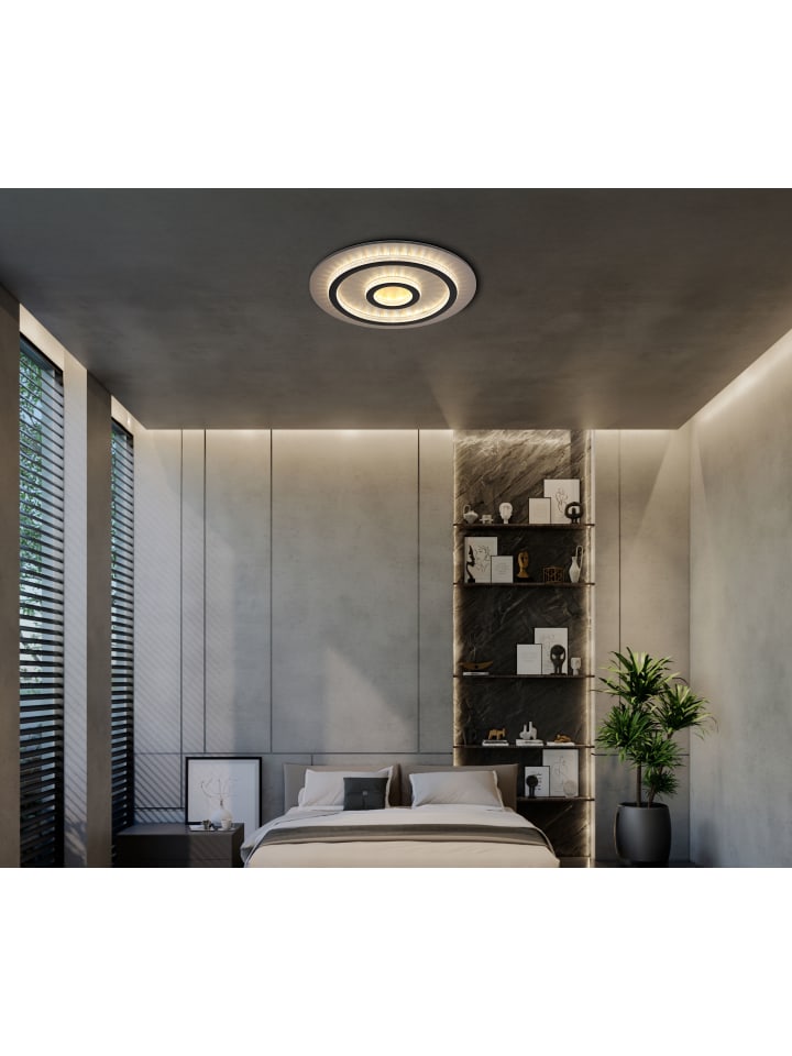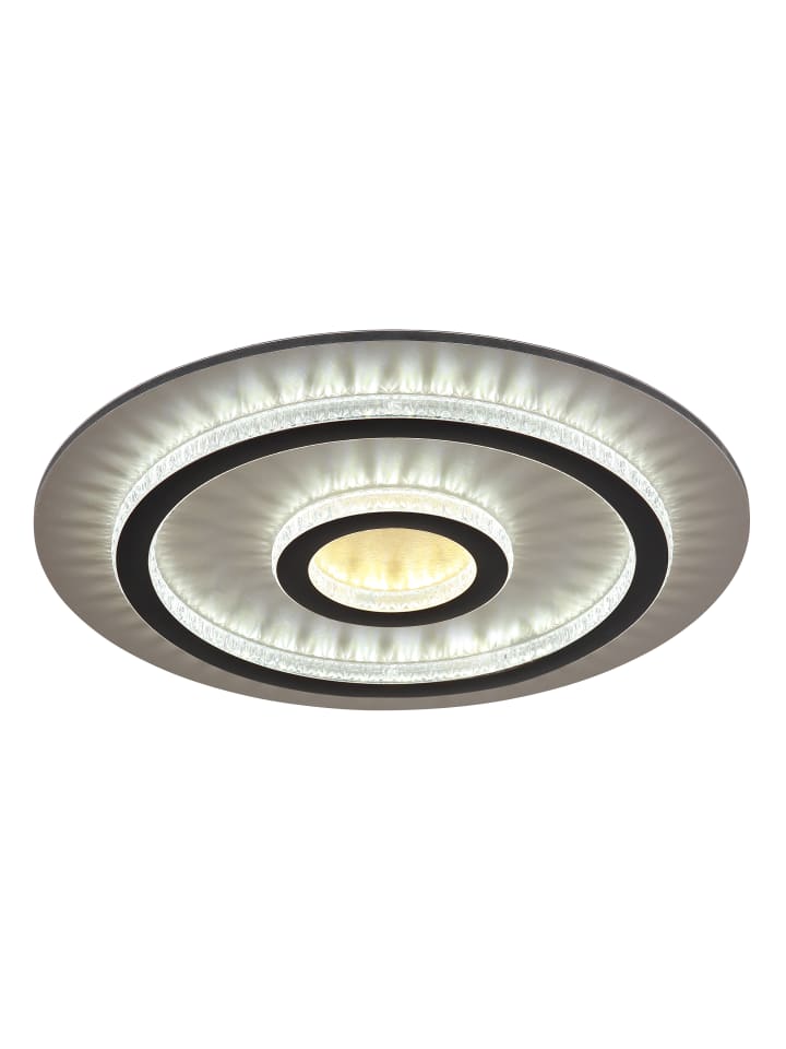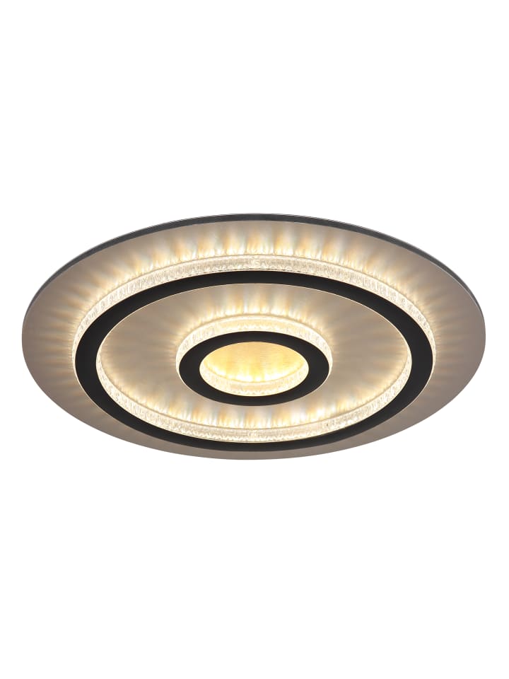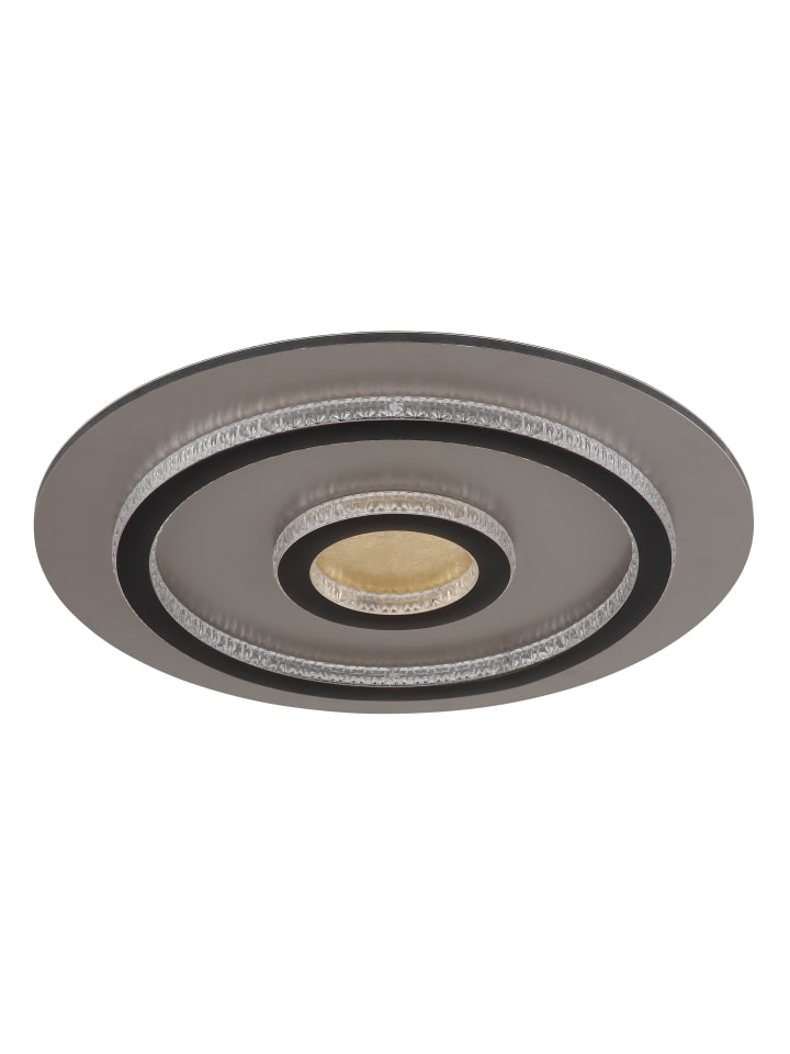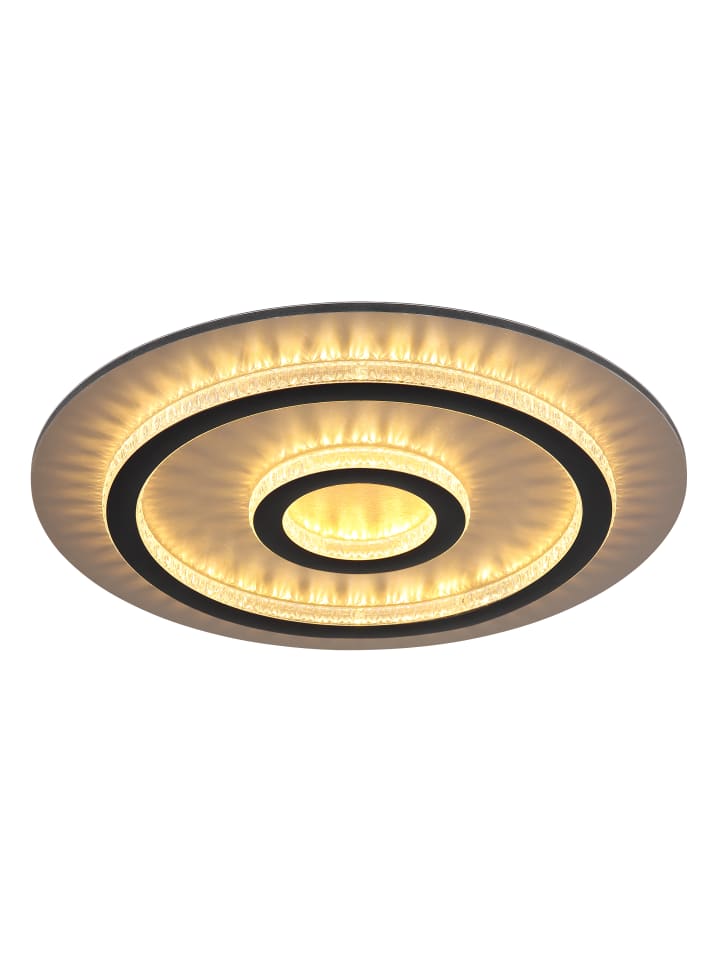 Потолочный светильник, металл матово-черный, пластик матово-золотистый, прозрачные пластиковые кристаллы, пластик матово-черный, регулировка яркости, несколько уровней с помощью настенного переключателя, возможность фиксации цветов, функция памяти, ночник, таймер, пульт дистанционного управления, батарейки в комплекте (2 шт. AAA), диаметр: 450 мм, высота: 55 мм, в комплекте светодиод 40 Вт 230 В, источник света 400-4700 лм, световой поток 130-1300 лм, цветовая температура 3000-6500 К