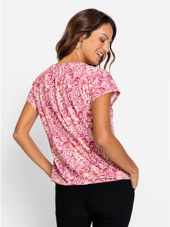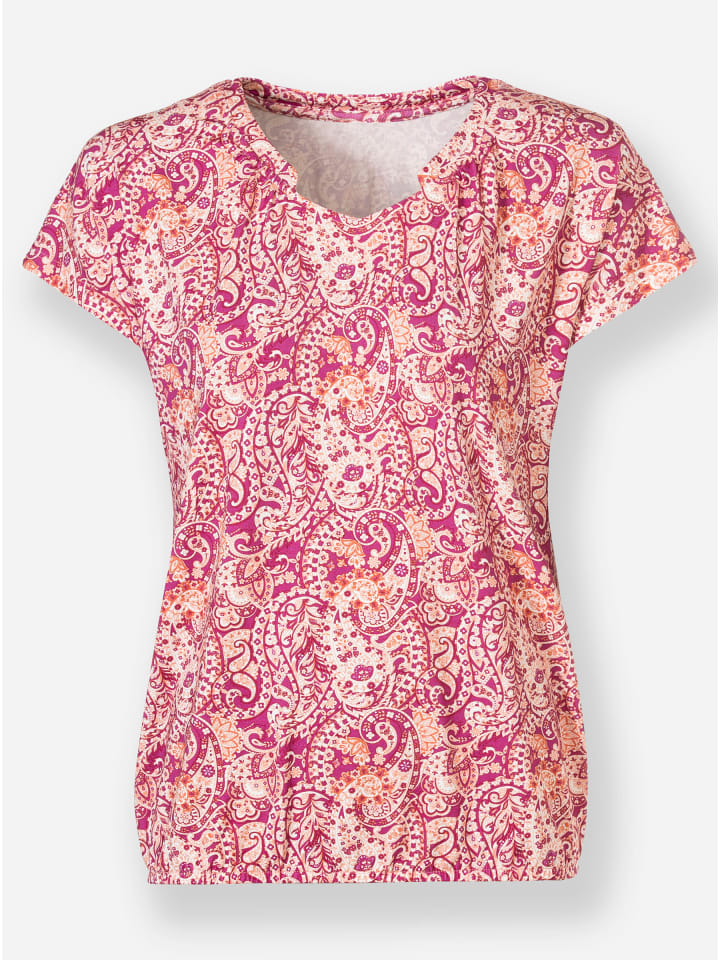 Мягкое качество, яркий узор пейсли и привлекательный крой - эта рубашка воплощает сразу три модных желания. Модный вырез с изящным воротником-стойкой и сборками спереди и сзади на шее. Спущенная линия плеча. Свободный крой благодаря эластичному низу. Вискоза качества ECOVERO от Lenzing.