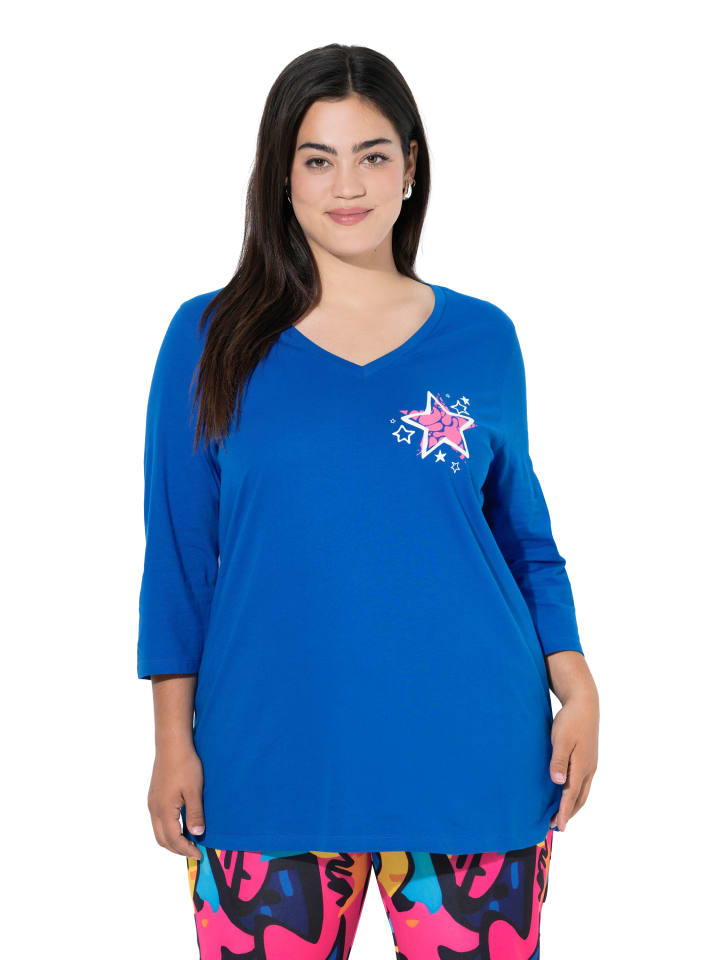 Футболка удобного кроя из мягкого трикотажа с крупным эффектным рисунком на спине. Спереди - маленькая звезда. V-образный вырез, рукава 3/4.