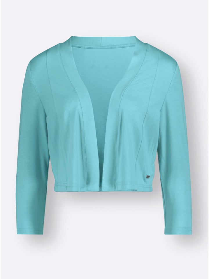 Отличный многослойный предмет одежды! Это легкое летнее болеро свободного кроя. Оно имеет округлую V-образную горловину, широкую планку спереди и рукава три четверти. Мягкая вискозная ткань обеспечивает струящуюся драпировку.
