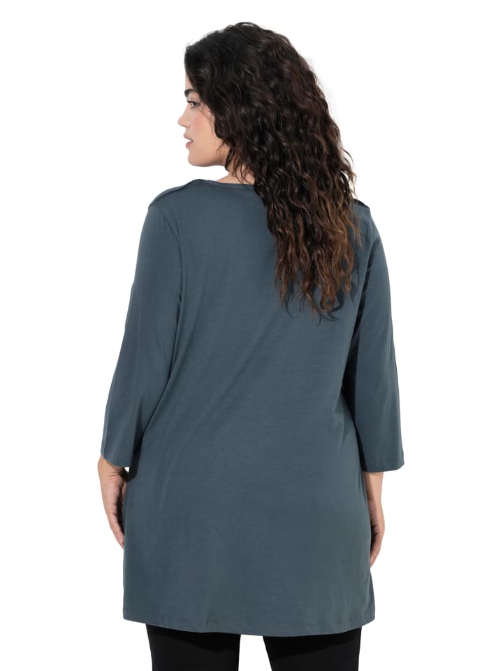 Футболка А-силуэта. Изготовлена из мягкого трикотажа с блестящей звездой, окрашена в холодную цветовую гамму для современного образа. Изящная кружевная отделка по подолу. Круглый вырез, рукава 3/4.