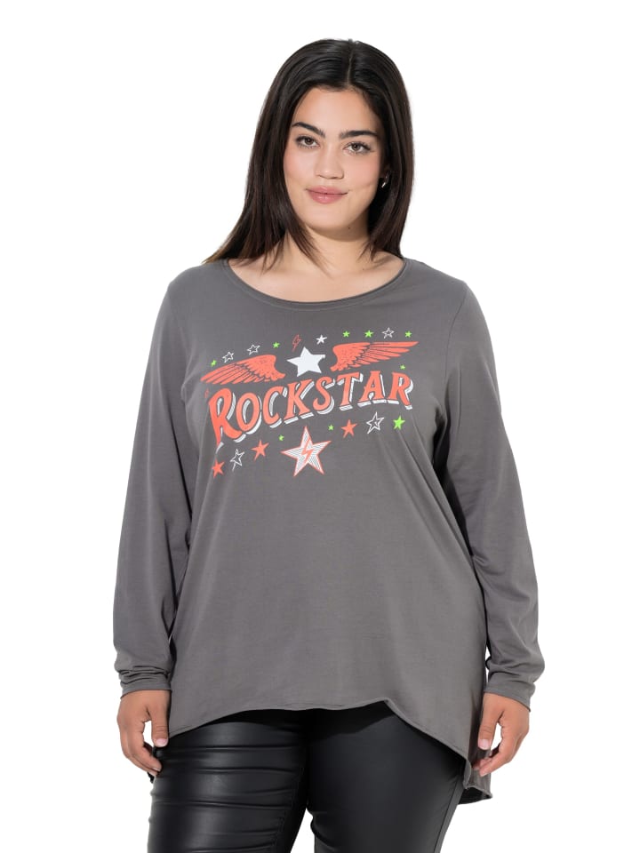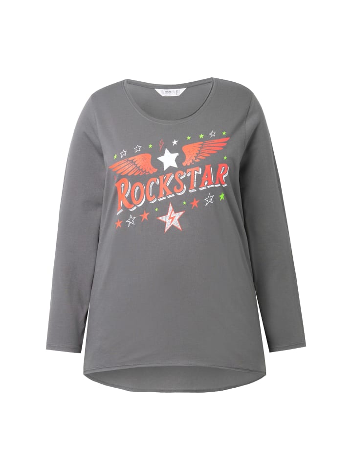 Футболка А-силуэта из мягкого трикотажа, винтажная стирка, с крупным принтом рок-звезды и необработанными краями. Круглый вырез горловины, длинные рукава. Закругленный подол, удлиненная спинка.