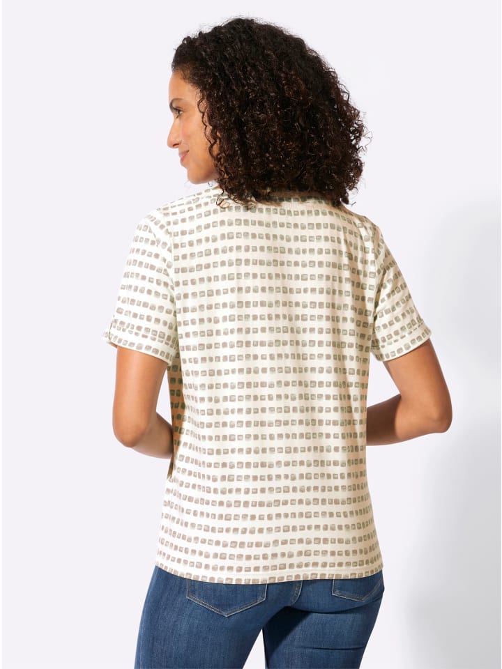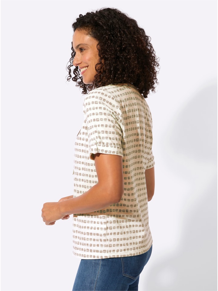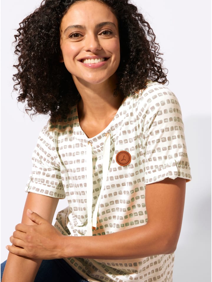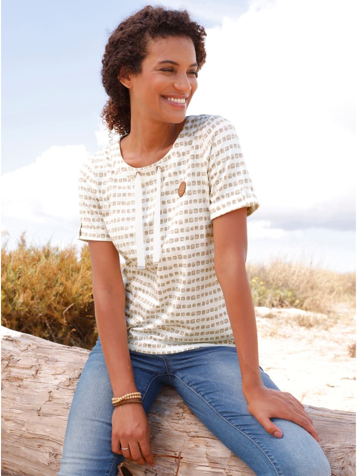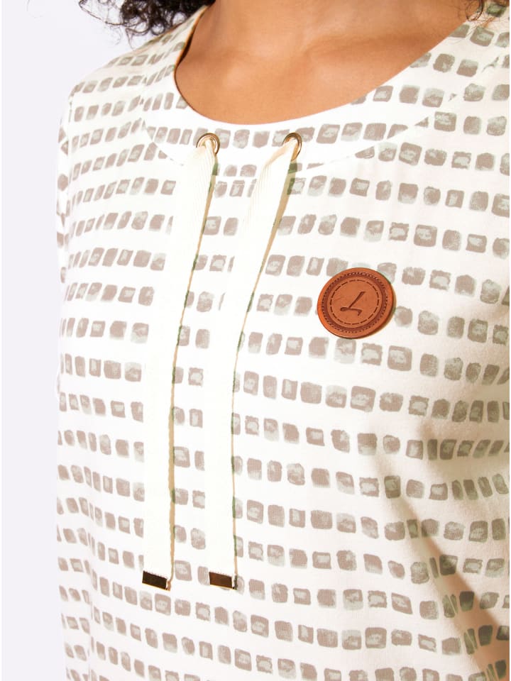 Впечатляюще красивая рубашка с принтом и завязками на круглом вырезе для индивидуальной регулировки ширины. Фиксированные манжеты на пуговицах на коротких рукавах. Передняя часть украшена нашивкой из искусственной кожи. Изделие сертифицировано GOTS.