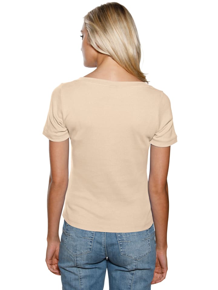 Футболка с квадратным вырезом и широким вырезом. Изготовлена из приятной на ощупь тонкой трикотажной ткани в рубчик. Облегающий крой.