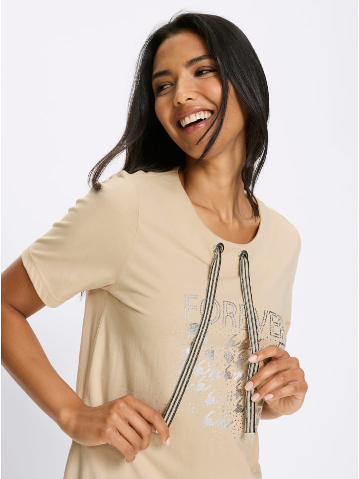 Эта стильная рубашка с короткими рукавами и сверкающим серебристым принтом, расположенным с особой тщательностью, словно говорит «Да!». Круглый вырез с широкой подгибкой, кулиской и полосатым галстуком.