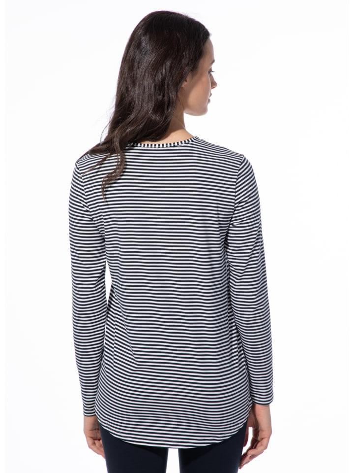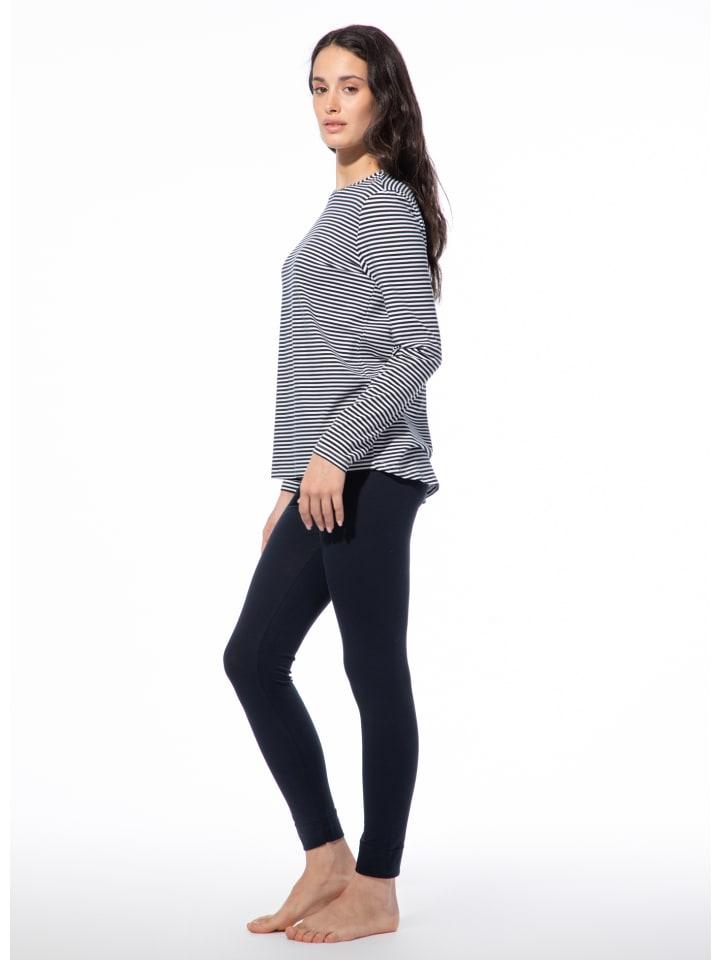 Этот элегантный женский топ с длинными рукавами от Short Stories, выполненный в классическом темно-синем полосатом дизайне, обеспечивает исключительный комфорт благодаря эластичному трикотажному полотну. Удлиненная закругленная спинка обеспечивает удобную посадку, а круглый вырез горловины с мягкой тесьмой и декоративным бантом внутри добавляет дополнительную деталь. Идеально подходит для сна или в качестве стильной домашней одежды, идеально сочетая комфорт и элегантность.