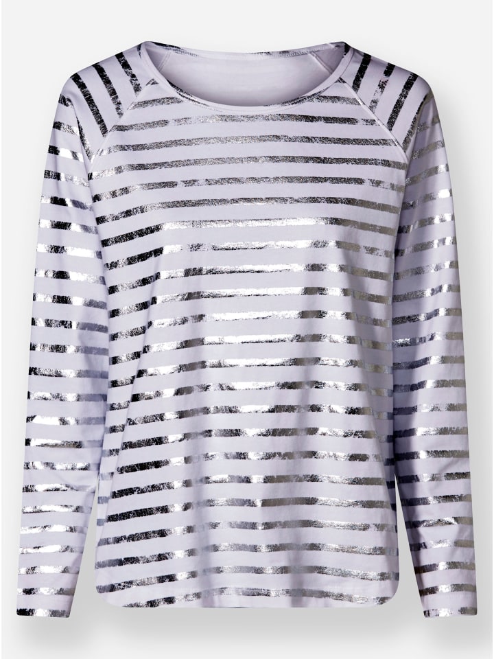 Рубашка для ослепительных сочетаний с модными полосками, напечатанными фольгой. Круглый вырез горловины и длинные рукава. Слегка закругленный подол. Поддерживает инициативу «Хлопок, сделанный в Африке».