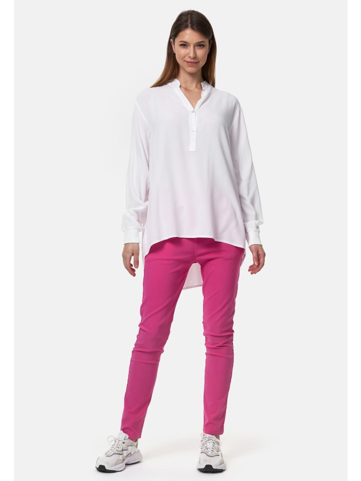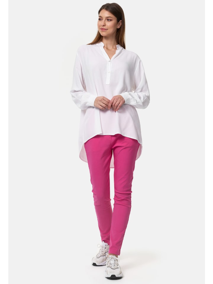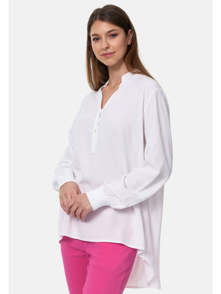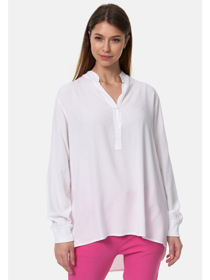 Женская блузка-рубашка свободного кроя с V-образным вырезом и длинными рукавами, изготовленная из 100% высококачественной вискозы. Длинные рукава немного шире и удобно и практично заканчиваются мягкими ребристыми манжетами. Небольшая складка сзади обеспечивает большую свободу движений и воздушный комфорт. Легкая, мягкая ткань приятна для кожи и обеспечивает максимальный комфорт, прохладу и гладкость - идеально подходит даже для теплых дней. Блузка-рубашка имеет прямой крой в легком стиле oversize, сзади немного длиннее, чем спереди. Передняя часть блузки ниспадает на бедра, а спинка закрывает бедра и таз. V-образный вырез заканчивается небольшим воротником. Красивый узкий планка с двумя перламутровыми пуговицами расстегивает тунику примерно до середины блузки.
