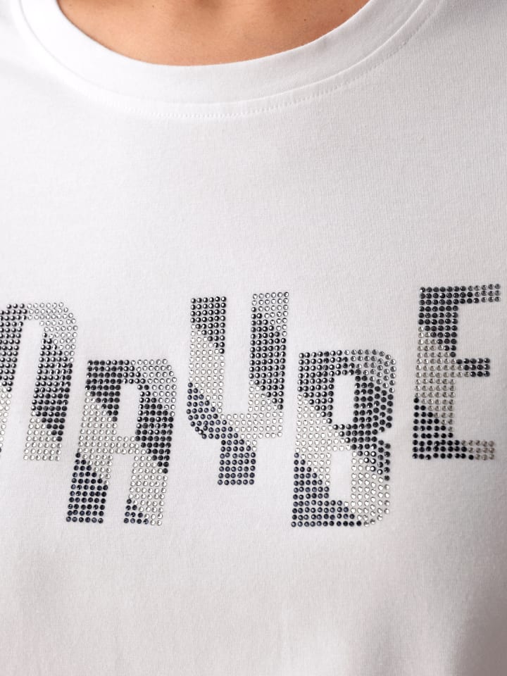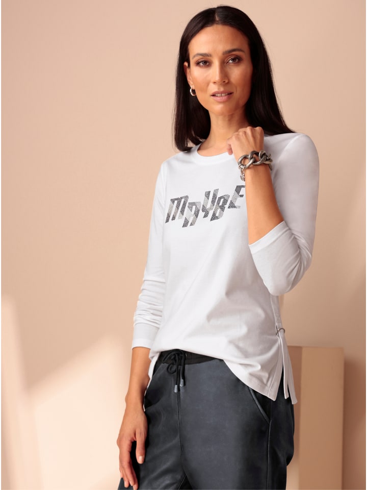 Эффектная рубашка: аппликация стразами MAYBE. Круглый вырез и длинные рукава. Боковые разрезы с декоративными хлястиками. В поддержку инициативы «Сделано в Африке».