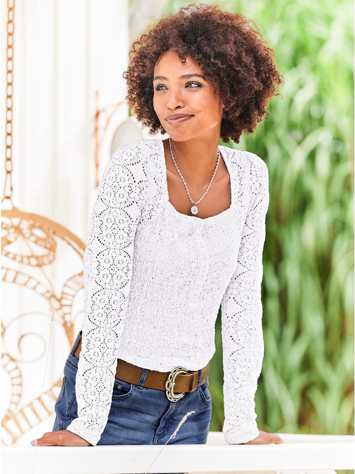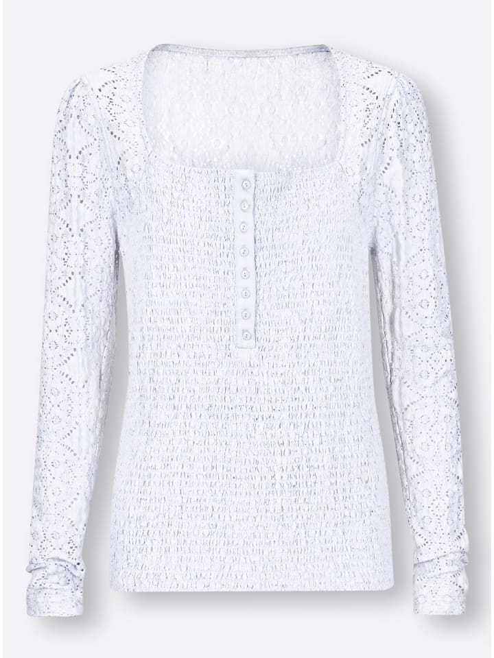 Рубашка с женственным квадратным вырезом и короткой планкой на пуговицах. Имеет присборенную вставку и длинные рукава из нежного кружева. Идеальная посадка благодаря эластичной ткани.