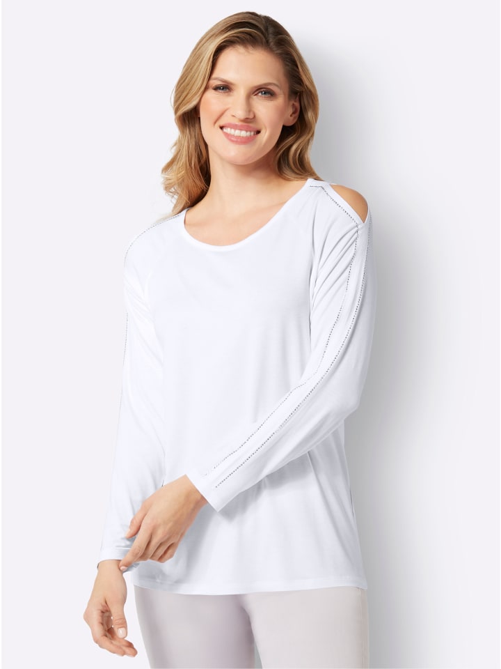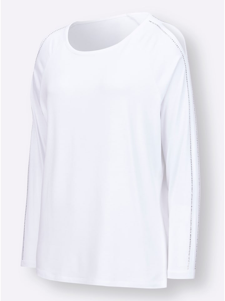 Полюбуйтесь! Эта рубашка с длинными рукавами из удивительно мягкой вискозы восхищает красивыми деталями: удобные рукава реглан украшены небольшим вырезом на плече и декоративными стразами по всей длине. Круглый вырез.