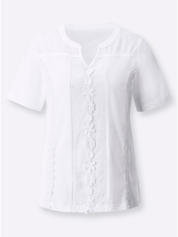 Особое внимание к деталям: рубашка с короткими рукавами и привлекательной вышивкой люверсами спереди. Отделка цветочным кружевом вдоль швов. Круглый вырез с небольшим V-образным вырезом.