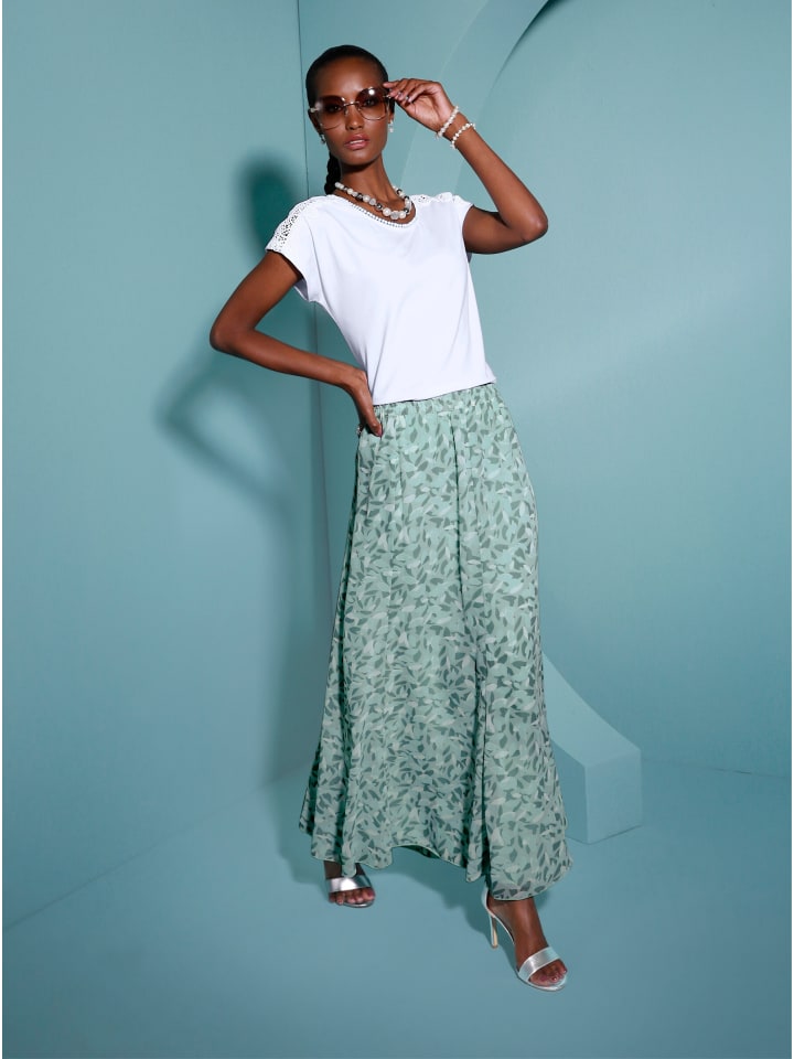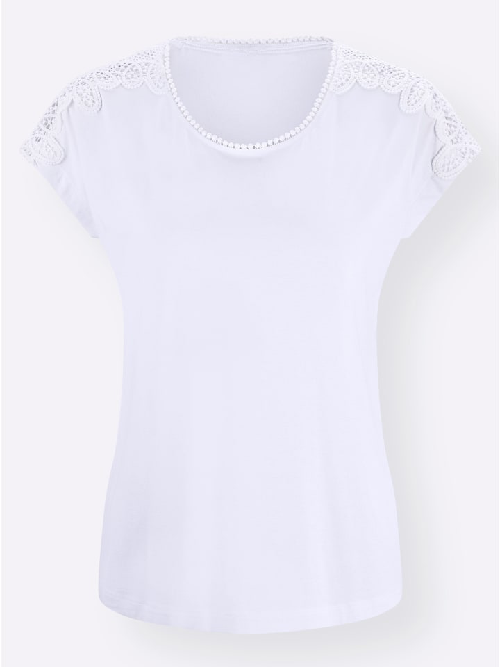 Эта мягкая рубашка из вискозы-стрейч с современными спущенными плечами украшена нежным кружевом. Декоративная кружевная отделка также проходит вдоль круглого выреза.