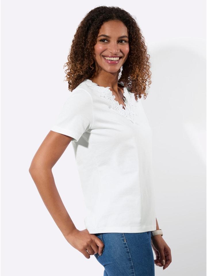 Универсальная рубашка с красивой кружевной отделкой вдоль V-образного выреза. Короткие рукава. Сертификация GOTS.