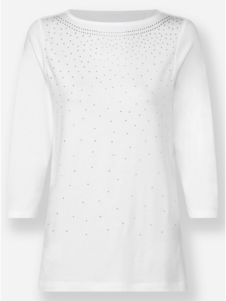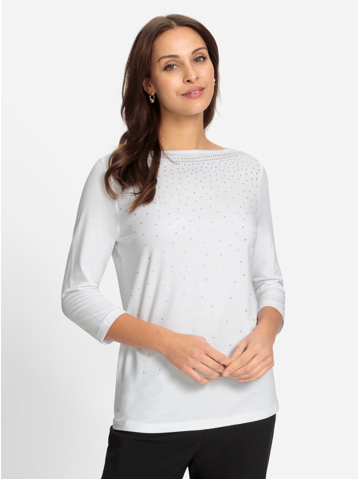 Мягкая, струящаяся и элегантно сверкающая: рубашка с рукавами 3/4 и стразами спереди. Женственный вырез «лодочка».