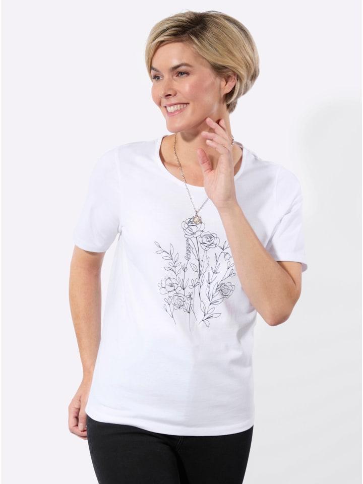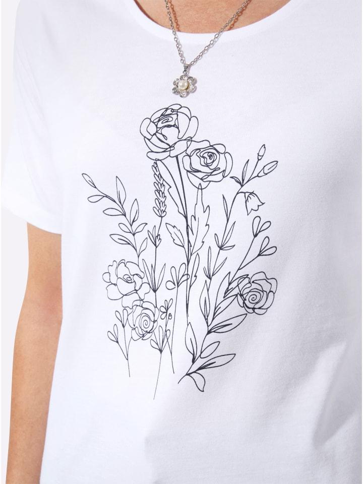 Универсальная рубашка из комфортного трикотажа с красивым цветочным принтом спереди. Круглый вырез и короткие рукава. Сертификация GOTS
