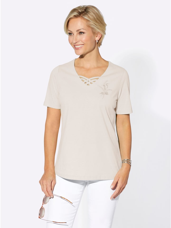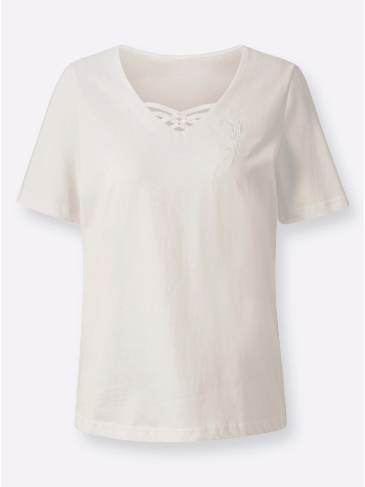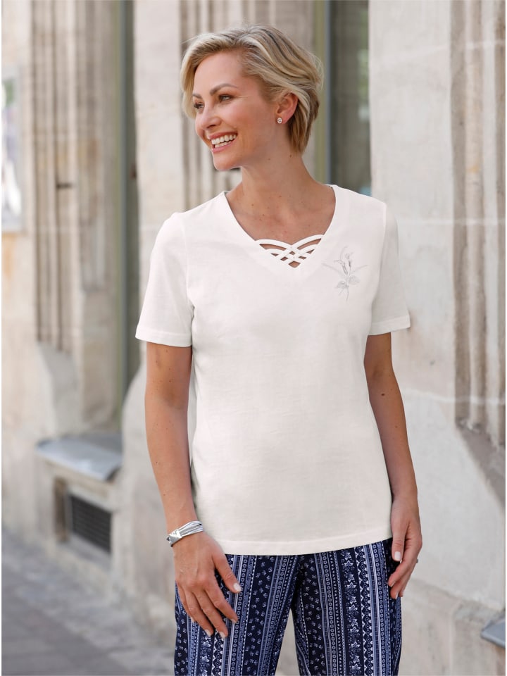 Исключительно удобная рубашка из мягкой смеси модала и хлопка. Имеет привлекательный V-образный вырез с декоративными полосками и стразами. Короткие рукава.