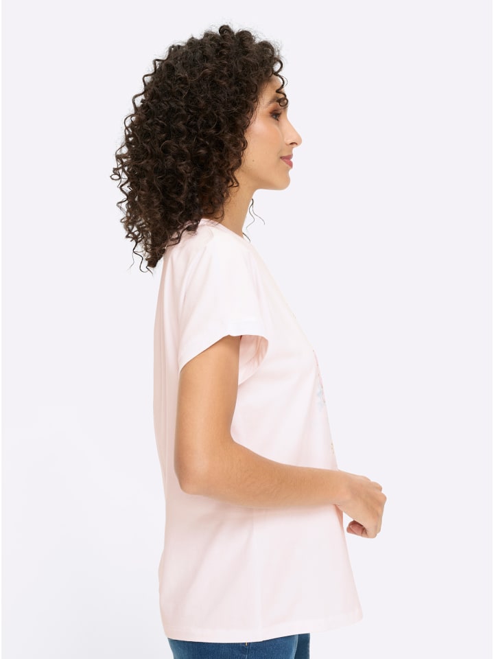 Футболка с глянцевым тиснением и надписью. Круглый вырез горловины, спущенные плечи и короткие рукава. Поддерживает инициативу «Хлопок, сделанный в Африке».