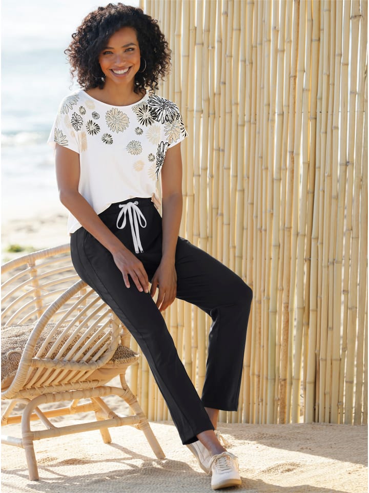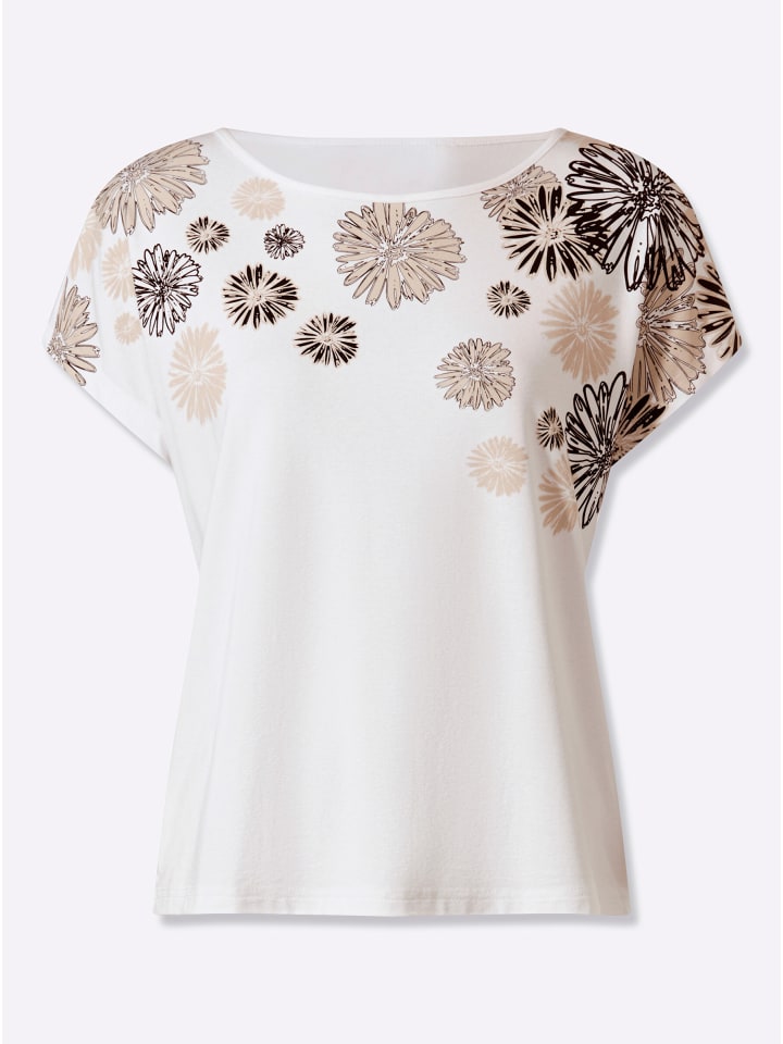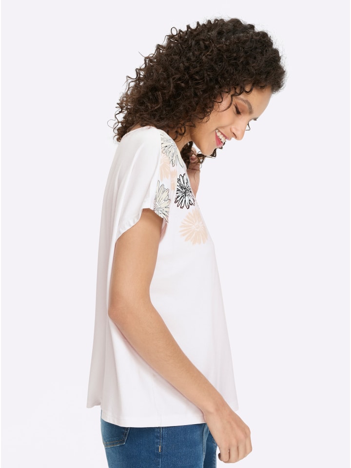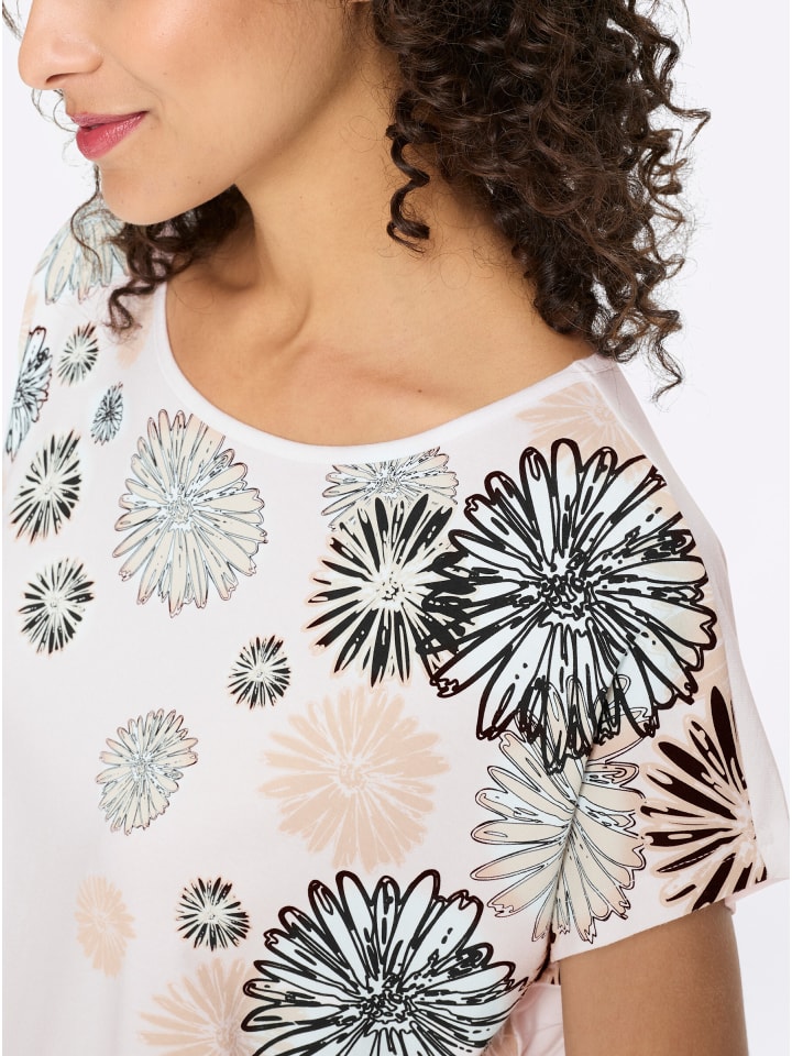 Футболка с привлекательным цветочным принтом на мягкой, струящейся ткани. Круглый вырез, спущенная линия плеча, короткие рукава. Изготовлена из вискозы Lenzing ECOVERO.