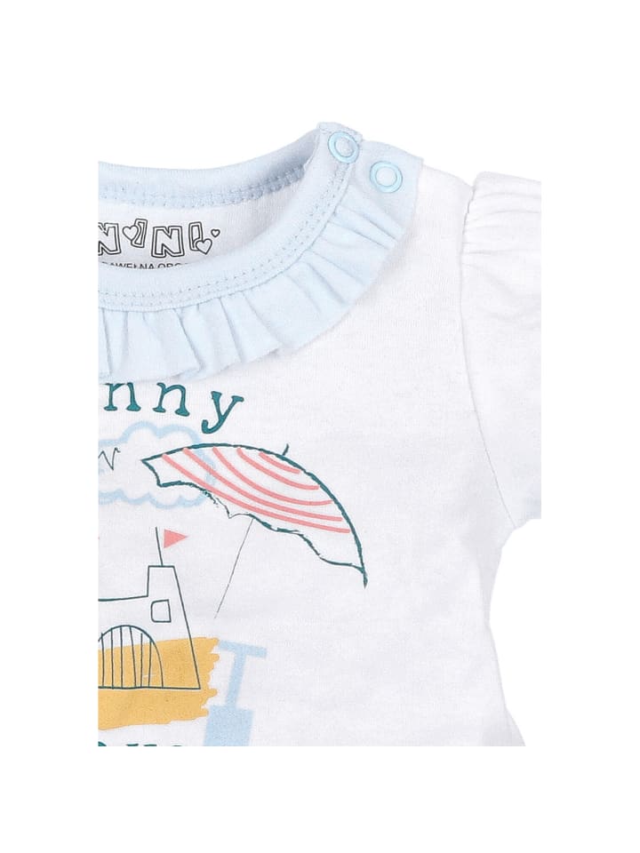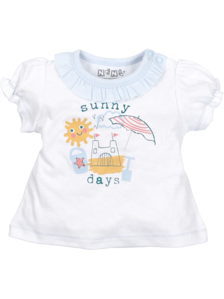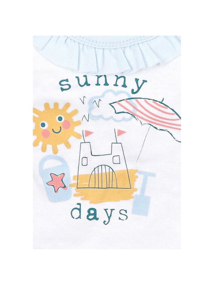 Эта футболка с заботливым дизайном добавит радости в детскую комнату благодаря ярким летним мотивам, таким как солнце, песчаный замок, зонтик и надпись «Солнечные дни?». Нежные цвета делают образ особенно дружелюбным и игривым. Милые оборки на горловине и рукавах придают футболке нежный, женственный вид. Благодаря кнопкам на плечах футболка легко расстегивается - идеально для быстрого одевания и раздевания. Мягкий материал не раздражает кожу малыша и обеспечивает комфортную носку изо дня в день. Идеально подходит для летних открытий.