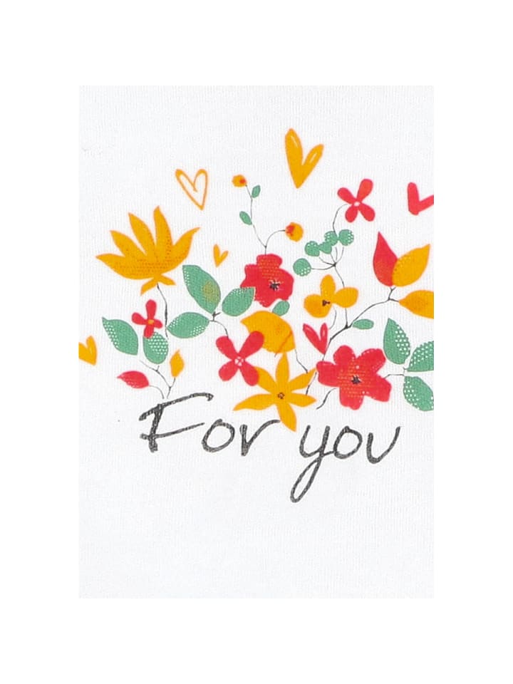 Эта детская футболка украшена ярким цветочным принтом. Очаровательная надпись «For You» занимает центральное место, добавляя нежный штрих. Цветочные акценты на вырезе и манжетах рукавов дополняют стильный дизайн. Футболка из мягкого материала особенно приятна к нежной детской коже. Две кнопки на плечах позволяют легко надевать и раздевать футболку. Благодаря удобному крою футболка идеально подходит для повседневной носки - как в помещении, так и на улице.