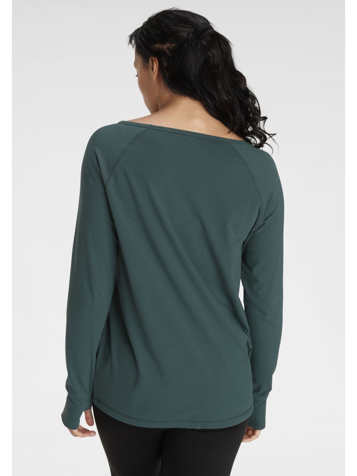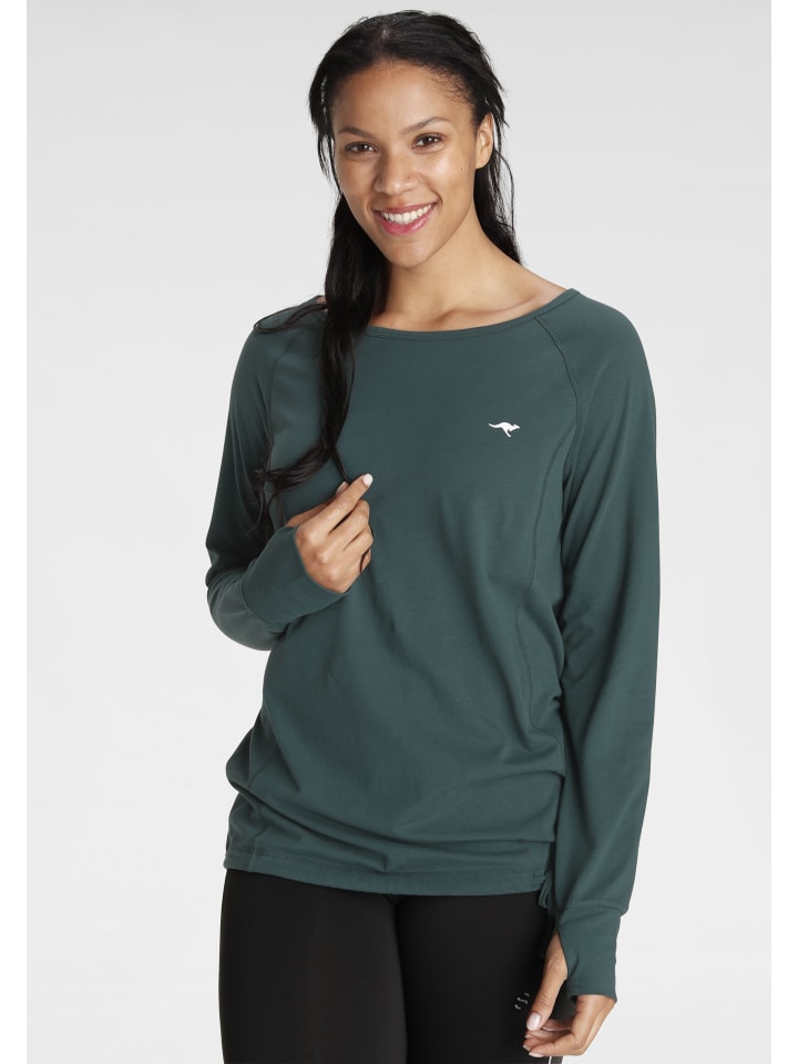 Спортивная женская рубашка с длинными рукавами от KangaROOS. Облегающий крой, подчеркивающий фигуру. Идеально подходит для спортивного образа. Мягкая хлопковая ткань делает этот топ исключительно удобным.