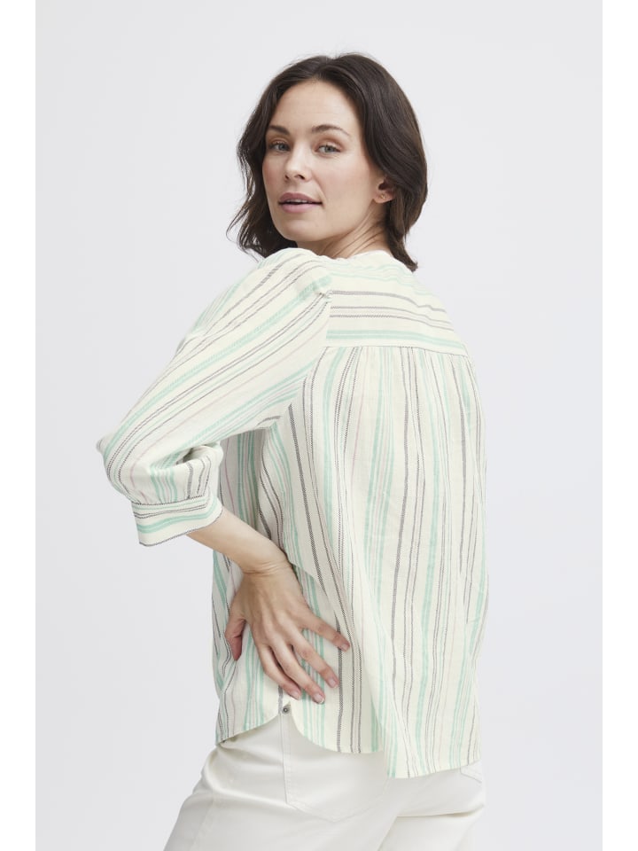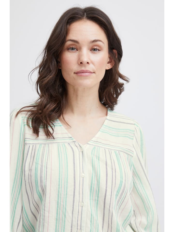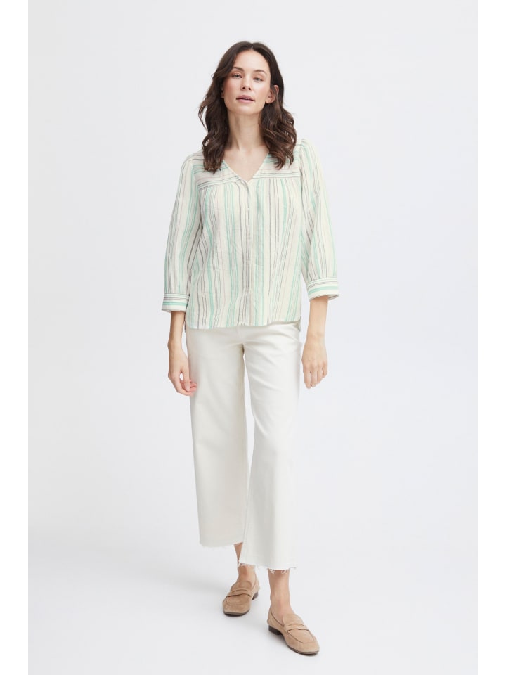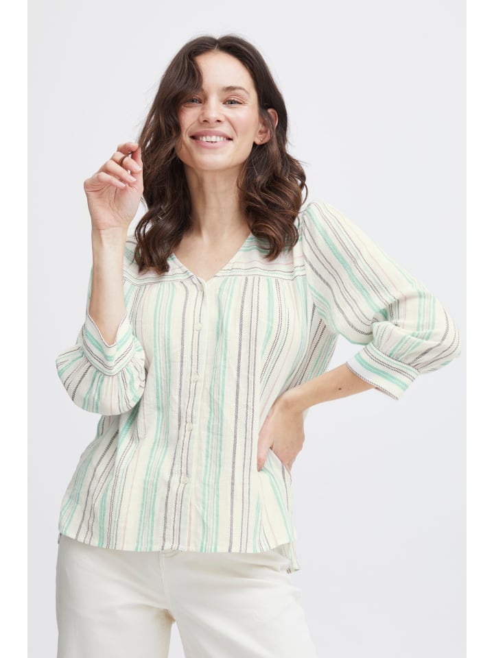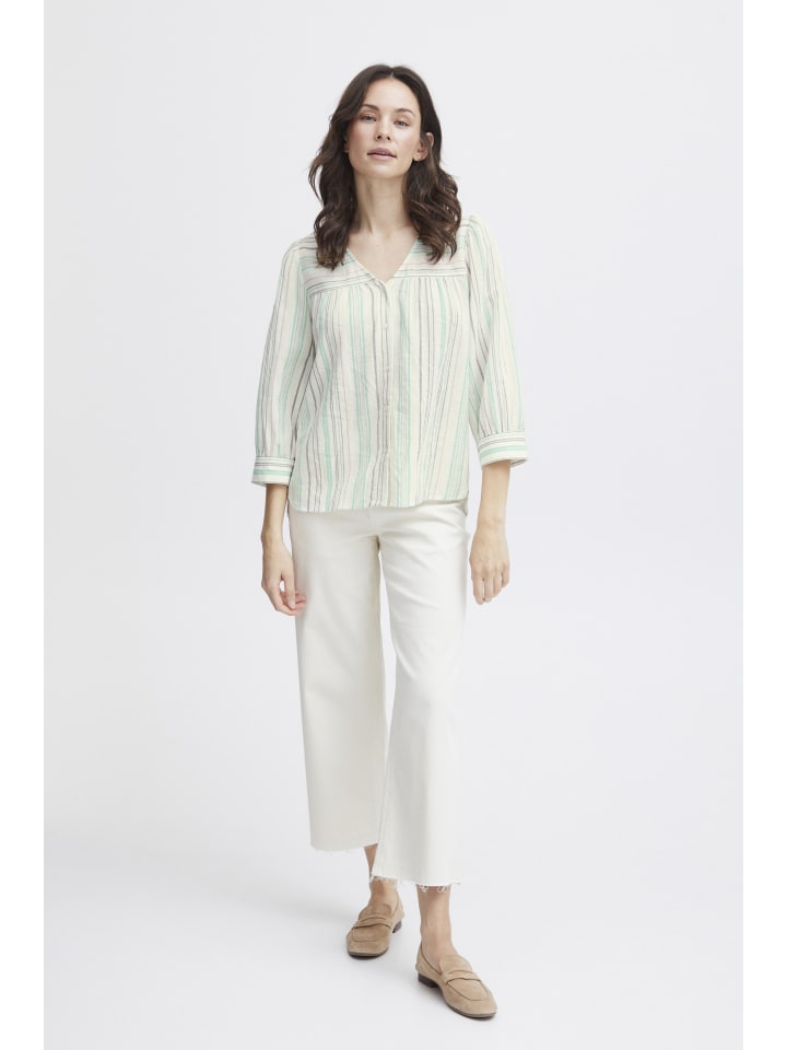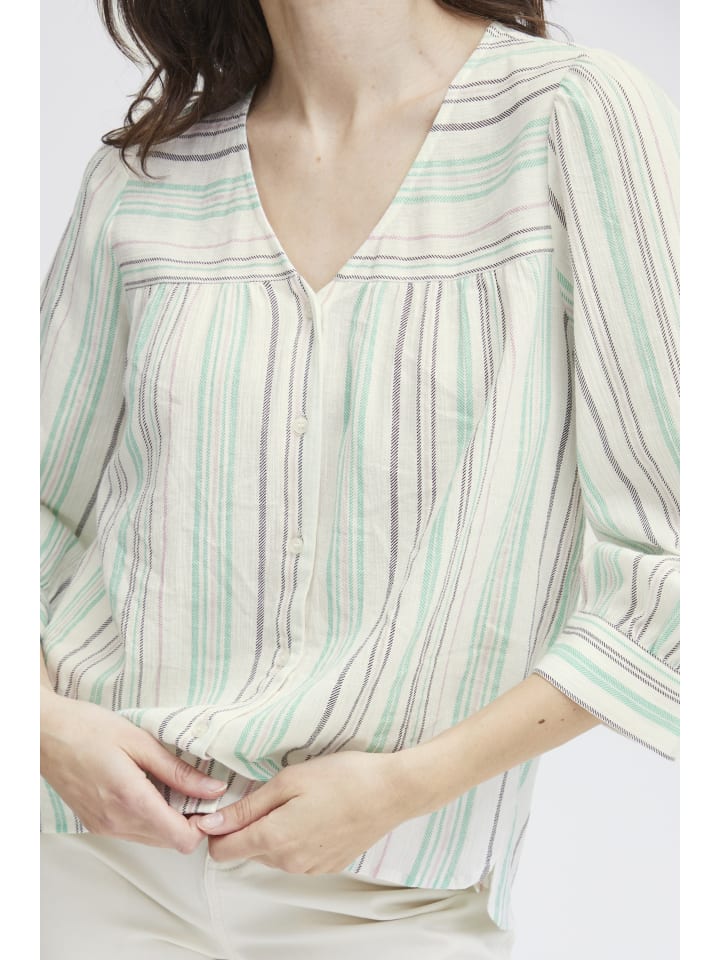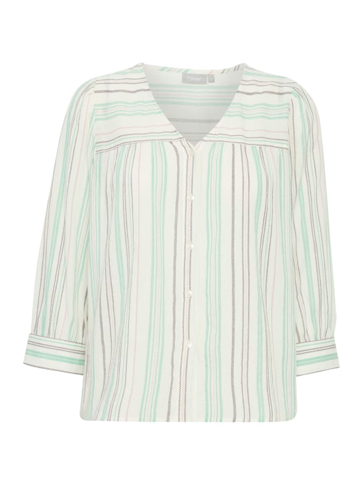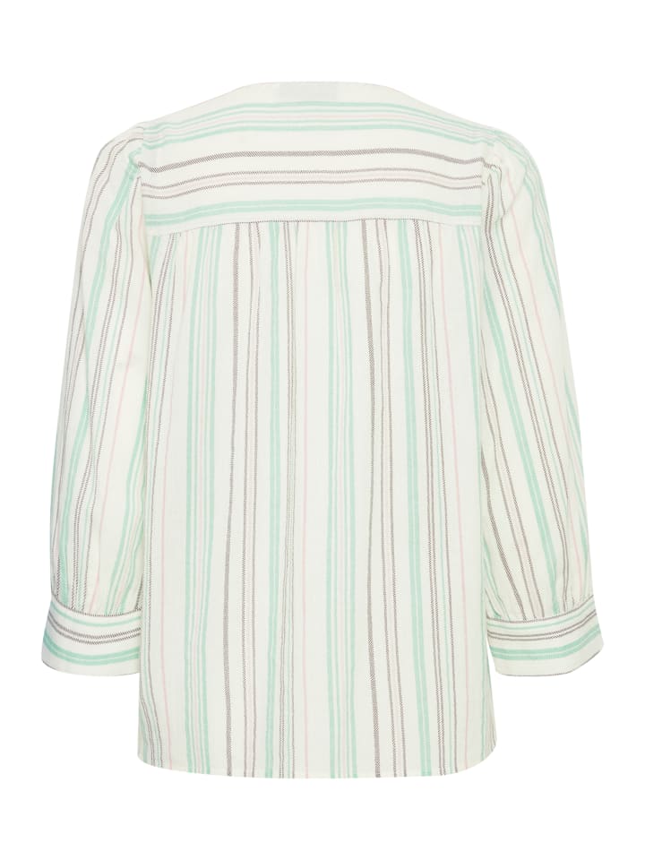 Полосатая блузка прямого кроя с V-образным вырезом и планкой на пуговицах. Рукава 3/4 с едва заметными манжетами и легкой, мягкой текстурой.