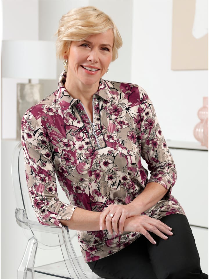 В универсальном цветочном дизайне: рубашка поло с отделкой стразами на воротнике и вдоль короткой молнии. Рукава длиной 3/4 с небольшим разрезом.