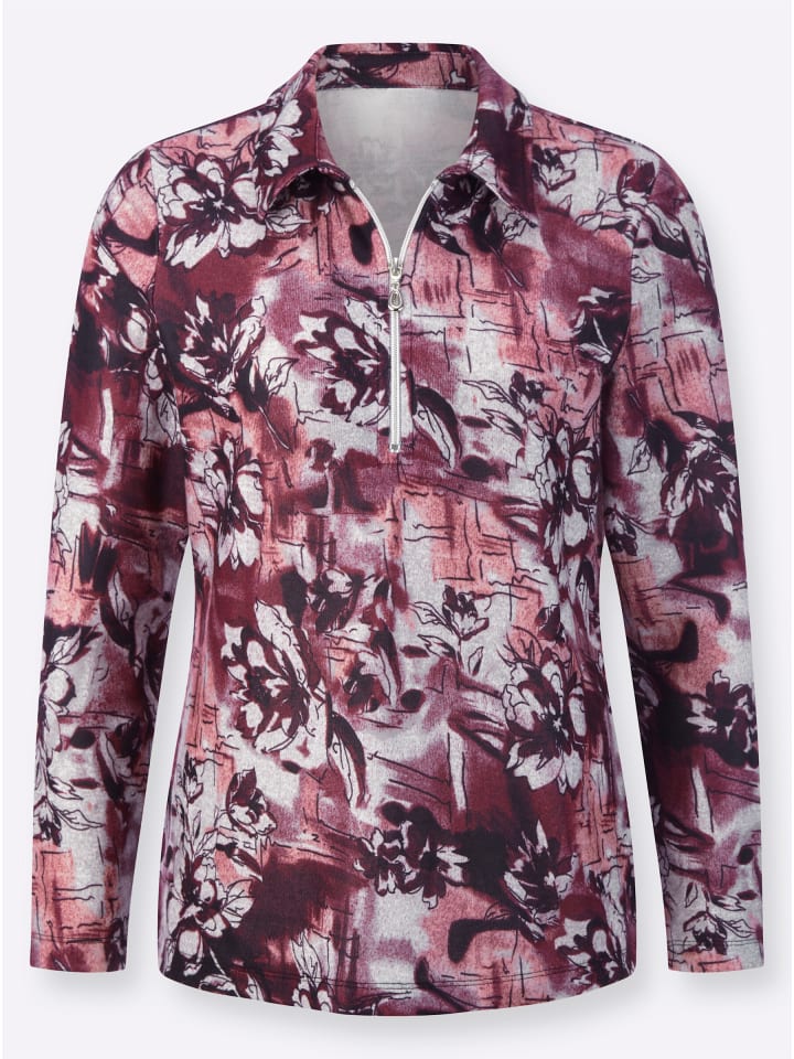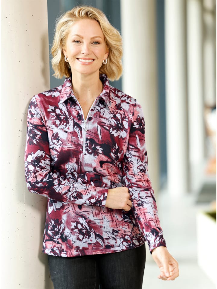 Простая в уходе модель на каждый день: универсальная рубашка-поло с цветочным рисунком. Аккуратный воротник-поло и серебристая молния. Изготовлена из теплой ткани с начесом, сохраняющей форму.