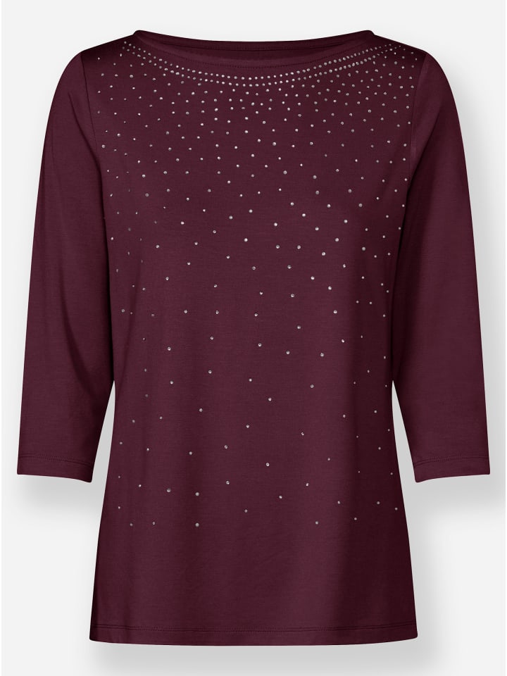 Мягкая, струящаяся и элегантно сверкающая: рубашка с рукавами 3/4 и стразами спереди. Женственный вырез «лодочка».