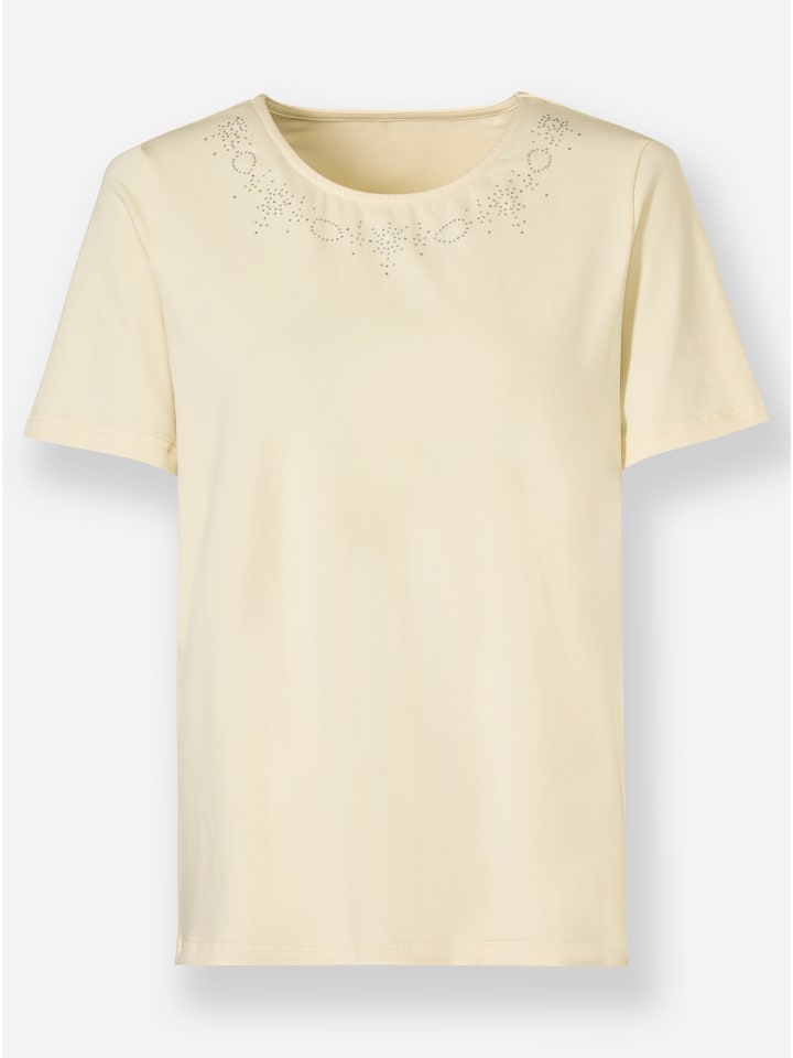 Декоративная отделка стразами вдоль круглого выреза может заменить ожерелье! Рубашка из мягкой смесовой ткани. Поддерживает инициативу «Хлопок, сделанный в Африке».