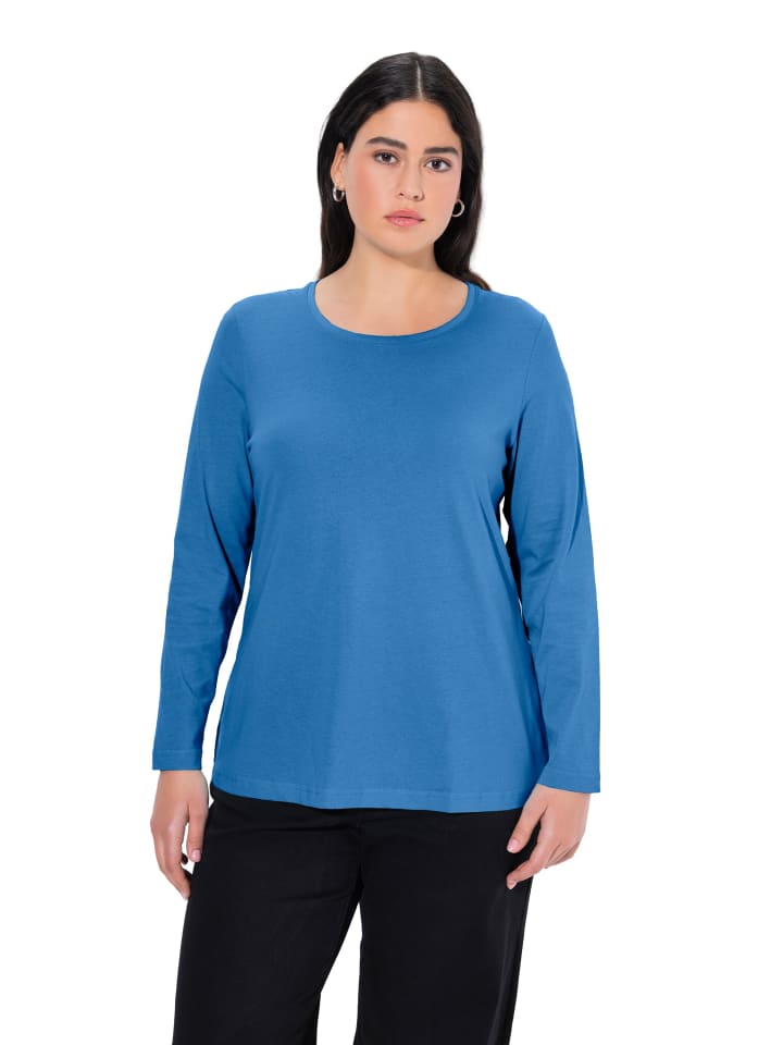 Рубашка с длинными рукавами. Круглый вырез горловины. Приталенный силуэт. Слегка расклешенный крой. Длина (с учетом размера): примерно 68-78 см. Красивый топ из высококачественного хлопка и вискозы с легким расклешенным кроем. С длинными рукавами и круглым вырезом горловины, доступен в различных цветах - невероятно универсален! Можно стирать в стиральной машине.