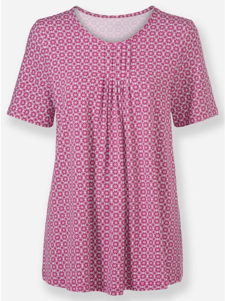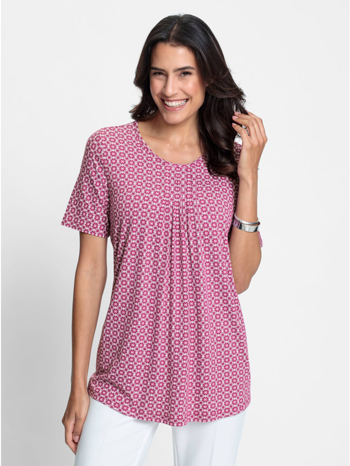 Привлекательный минималистичный орнаментальный принт, мягкая ткань, подчеркивающий фигуру А-силуэт - эта туника-рубашка просто убеждает во всем. Складки на круглом вырезе с окантовкой расширяются к низу, создавая эффект стройнения. Вискоза качества ECOVERO от Lenzing.