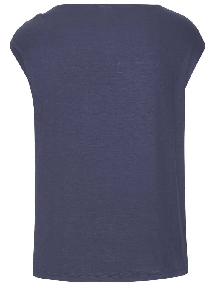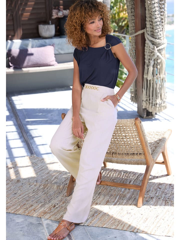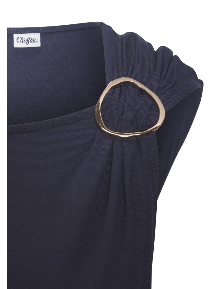Красивая трикотажная рубашка от Vivance с блестящей декоративной пряжкой на одном плече. Круглый вырез. Короткие втачные рукава. Комфортный крой. Мягкий эластичный трикотаж.