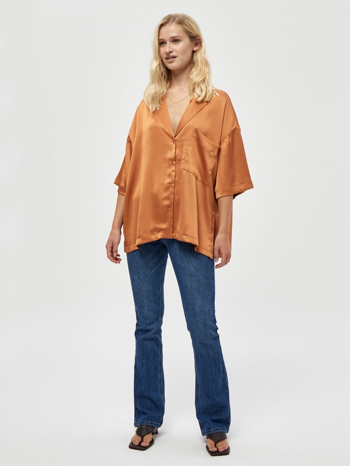 Рубашка Elotta имеет стильный свободный крой с рукавами до локтя и слегка объемным кроем. У рубашки V-образный вырез, застежка на пуговицы спереди и разрезы по бокам.