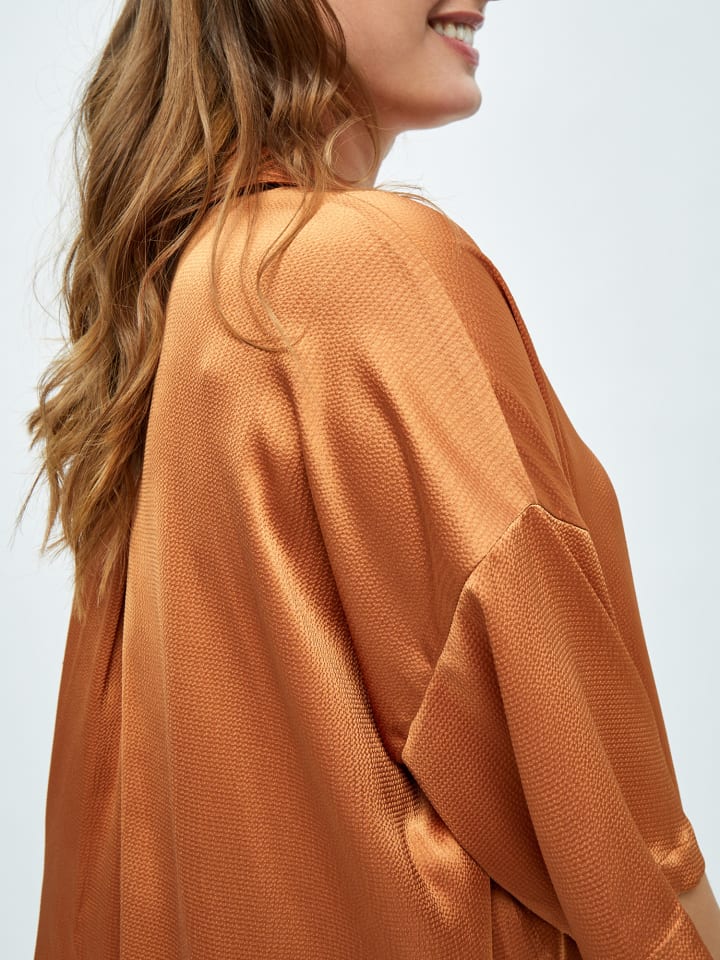 Рубашка Elotta имеет стильный свободный крой с рукавами до локтя и слегка объемным кроем. У рубашки V-образный вырез, застежка на пуговицы спереди и разрезы по бокам.