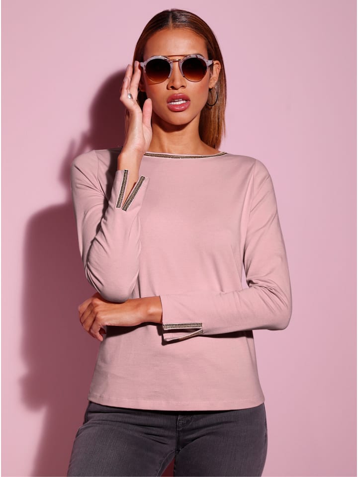 Изюминкой этой рубашки является декоративная отделка мерцающими стразами на вырезе «лодочка» и манжетах длинных рукавов с разрезами.