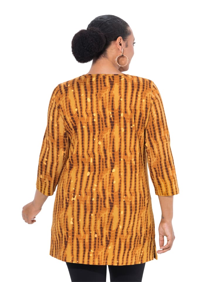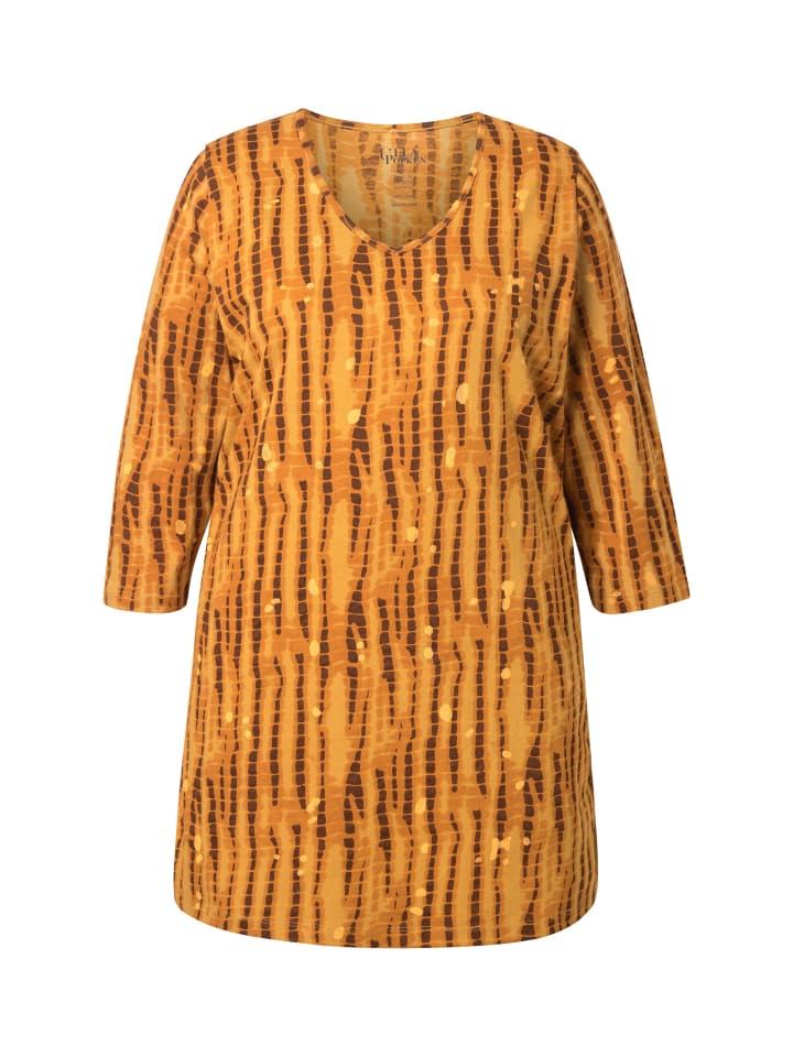Рубашка А-силуэта с длинными рукавами из мягкого трикотажа с рисунком в стиле батик. V-образный вырез, рукава 3/4. Удобный широкий подол с боковыми разрезами для дополнительного комфорта.