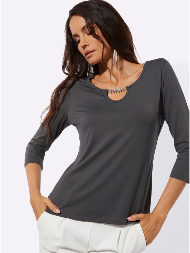 Декоративная цепочка со сверкающими стразами на комбинированном круглом и V-образном вырезе делает дополнительные ожерелья ненужными к этой рубашке. Рукава 3/4. Изготовлена из вискозы Lenzing ECOVERO.