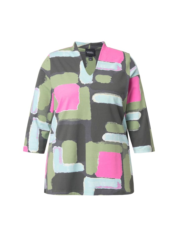Футболка классического кроя из приятного к телу эластичного трикотажа с графическим принтом. V-образный вырез, рукава 3/4.