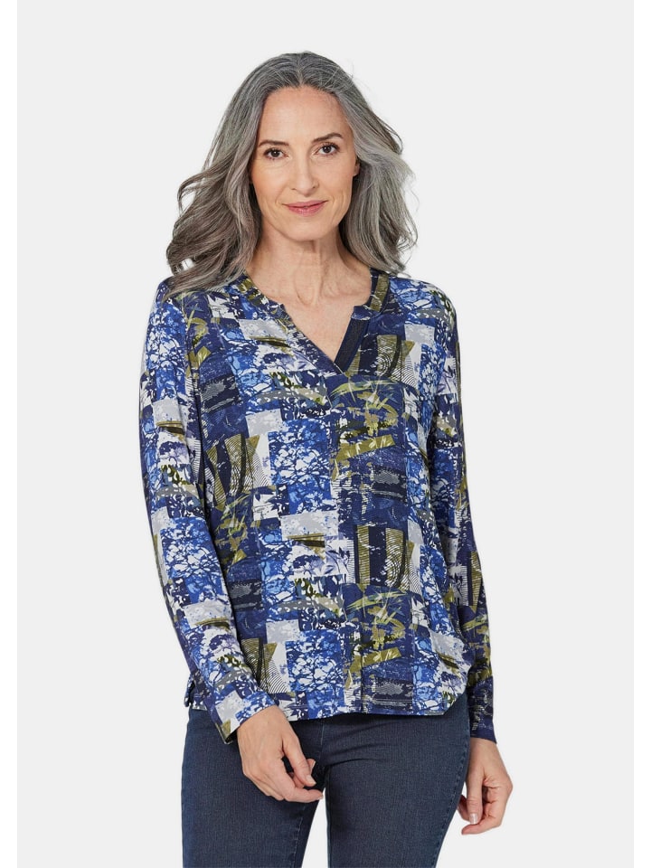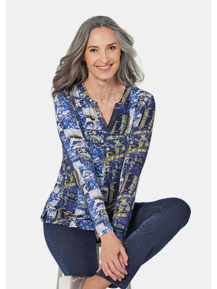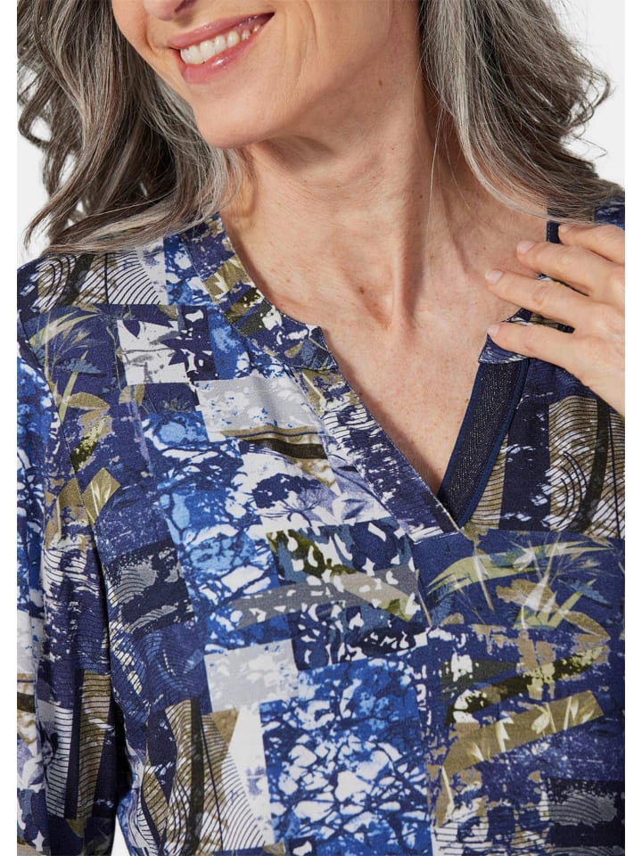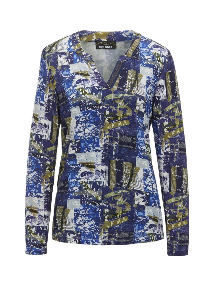 Футболка с эффектным принтом, эксклюзивно в GOLDNER. Круглый вырез с разрезом особенно привлекателен. Элегантная резинка с мерцающими нитями добавляет особый штрих нижней части изделия. Изготовлена из мягкой, приятной для кожи смеси вискозы и эластана для максимального комфорта. Длина: около 66 см для размера 46, около 62 см для размера 23.