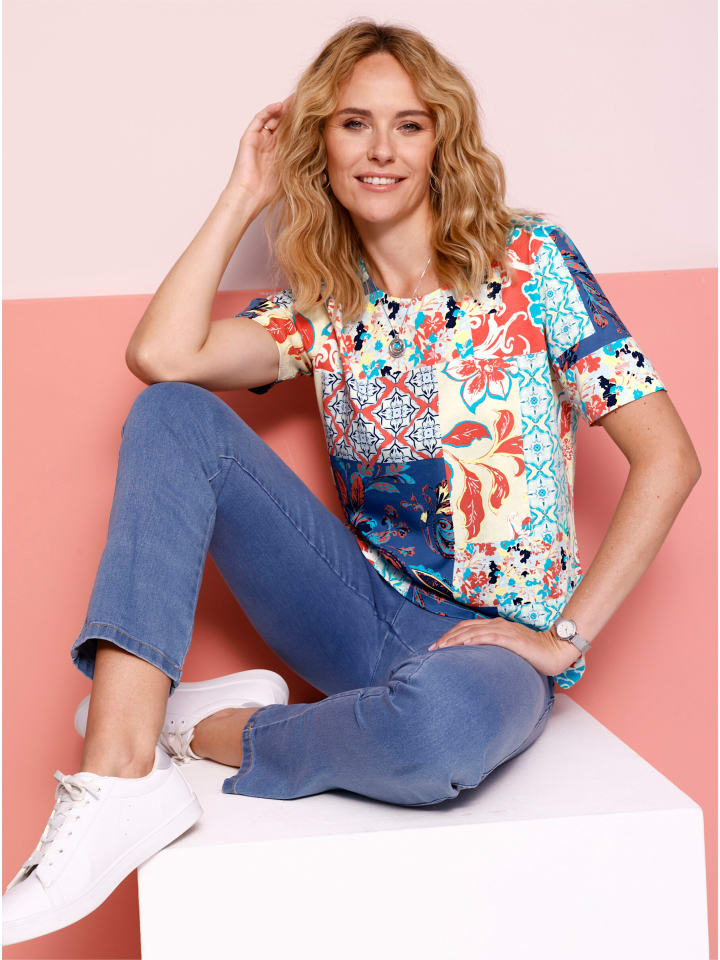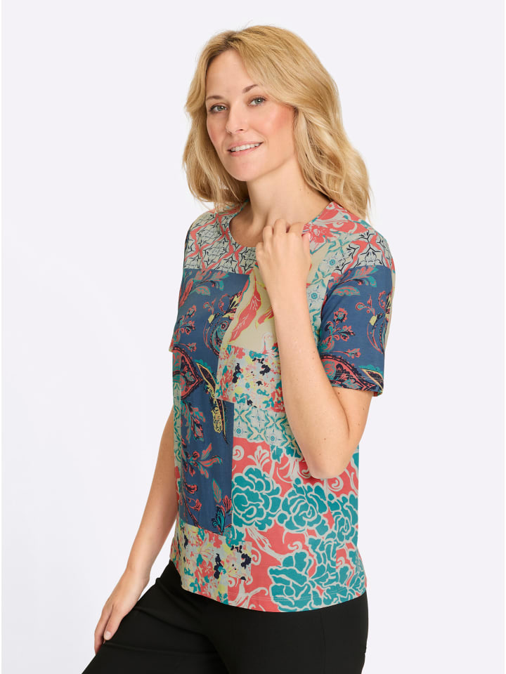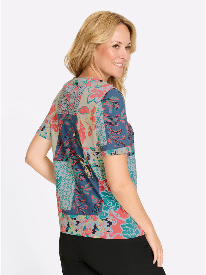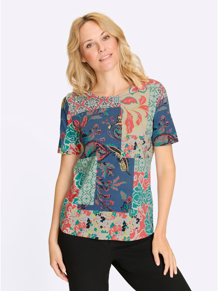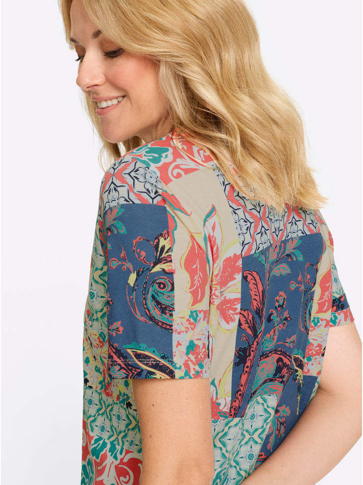 Зачем выбирать один дизайн, когда можно использовать несколько цветочных и орнаментальных узоров на этой рубашке в стиле пэчворк с короткими рукавами! Круглый вырез горловины с внутренней окантовкой.