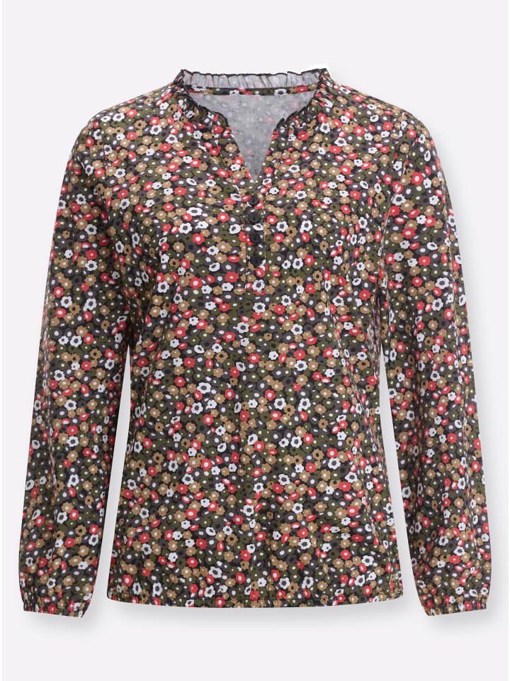 Маленькие цветы - последний писк моды на этой рубашке с длинными рукавами! Круглый вырез с небольшим V-образным вырезом и короткой планкой на пуговицах украшен оборками. Еще один плюс: эластичные манжеты и подол создают удобную посадку.
