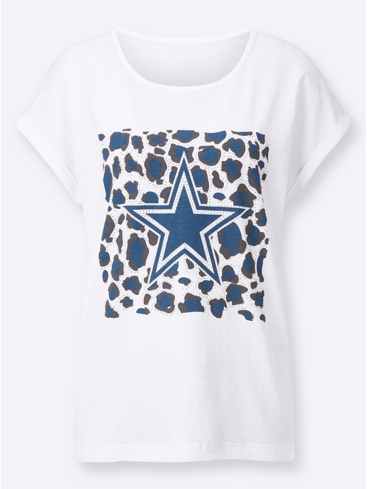 Рубашка «Звезда родилась!» с изображением звезды, анималистичным принтом и декоративными заклепками спереди. Круглый вырез горловины, спущенные плечи и приталенные манжеты. Поддерживает инициативу «Хлопок, сделанный в Африке».