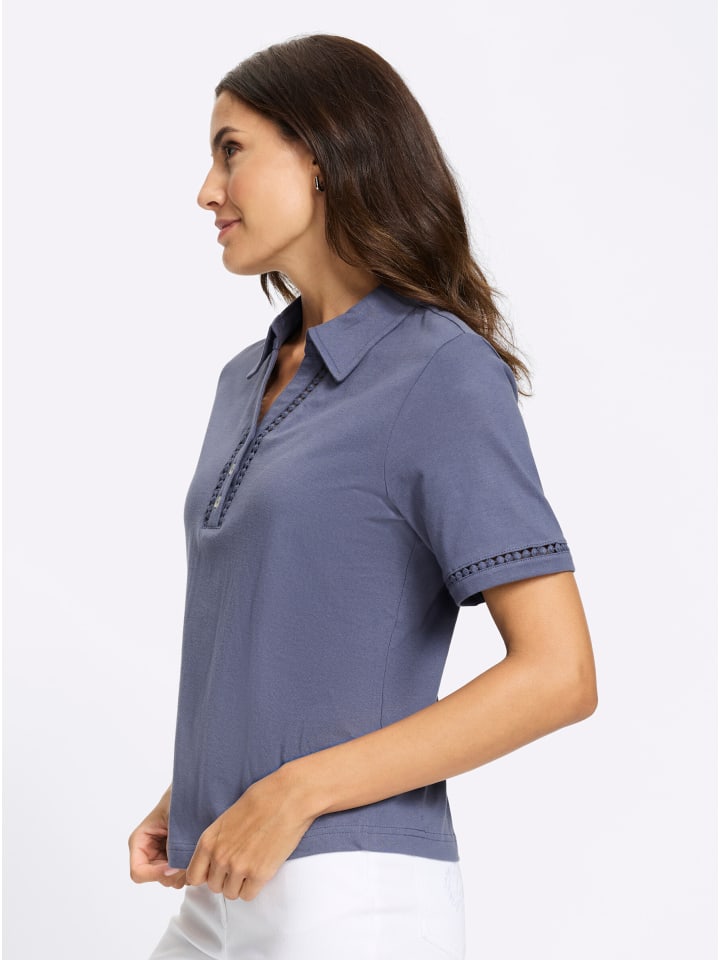 Эта рубашка-поло из приятного органического хлопка привлекает внимание прозрачной кружевной отделкой на коротких рукавах, а также по обеим сторонам V-образного выреза и планки с пуговицами. Рубашка украшена пуговицами с роговым эффектом и слегка закругленным нижним краем. Сертифицировано GOTS, изготовлено из органического хлопка.