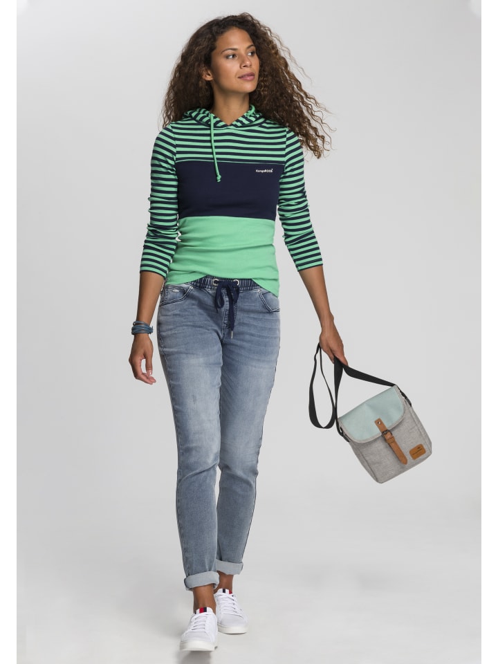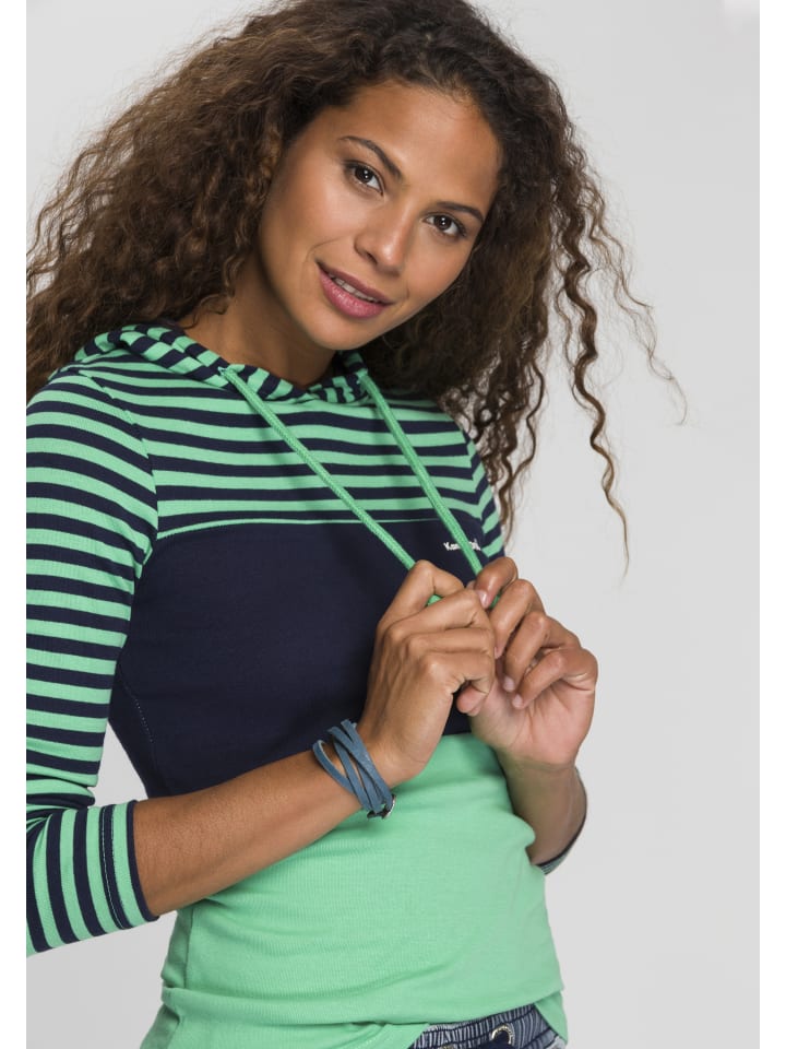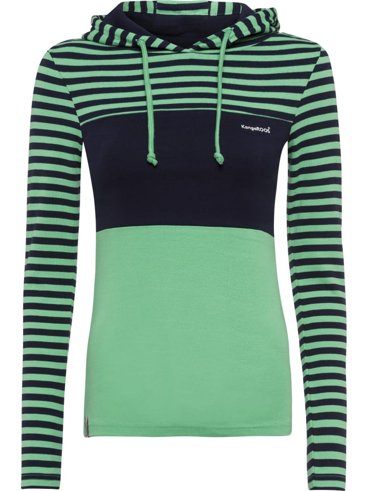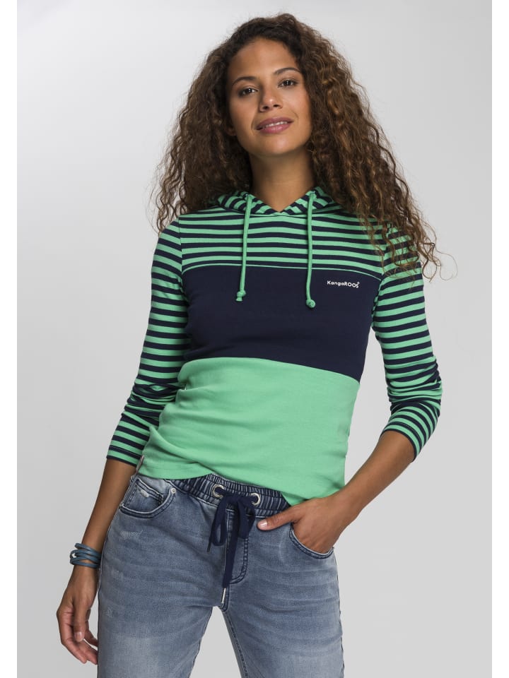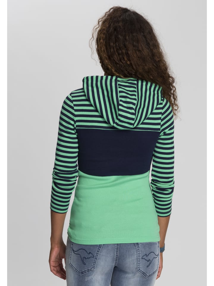 Простая женская рубашка с капюшоном от KangaROOS с эффектными цветовыми блоками. Приталенный крой до бедер и длинные рукава. Высокоэластичная рубчатая ткань адаптируется к форме тела.